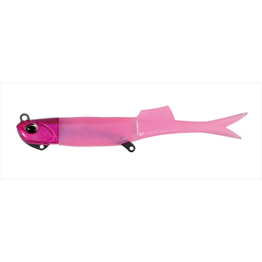 シャッド、グラブに続く第三の波動。小魚をイメージさせるスリムなシルエットと尾部の先割れフィンとボディ中央の体節と背中のバイブスフィン(背ビレ)が、新しいハウルフィッシュの特徴。薄い体節でボディを区切るだけでなく、背中のバイブスフィンで水を受けることで、後ろ半分が細かく高速微振動(バイブレーション)してヒラメを誘う。横流れを受けてターンする際は、体節より後ろが一瞬、大きく曲がって、アクションが変化して喰わせに繋がる。ワームマテリアルを見直したことに加えて、体節からテールまでが薄い設計のため、テールがブレずに飛んで飛距離がアップ。同時に糸絡みも軽減。