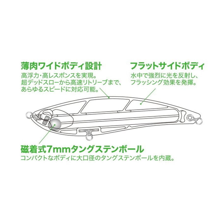 小さな巨人!ボディサイズを超える圧倒的アピール力!高浮力ワイドボディがもたらすトルクフルな水押しで抜群のアピール力を誇るフラットサイドリップレスミノーが誕生!広範囲から魚を呼ぶパワーを持ちながら、違和感なくバイトに持ち込むコンパクトな95ミリサイズに設定。優れたレンジコントロール性能と高いアクションレスポンスであらゆる攻め方に対応。7mmタングステンボール搭載で抜群の飛距離とキャストフィールを実現しています。【薄肉ワイドボディ設計】高浮力・高レスポンスを実現。超デッドスローから高速リトリーブまで、あらゆるスピードに対応可能。【フラットサイドボディ】水中で強烈に光を反射し、フラッシング効果を発揮。【磁着式7mmタングステンボール】コンパクトなボディに大口径のタングステンボールを内蔵。