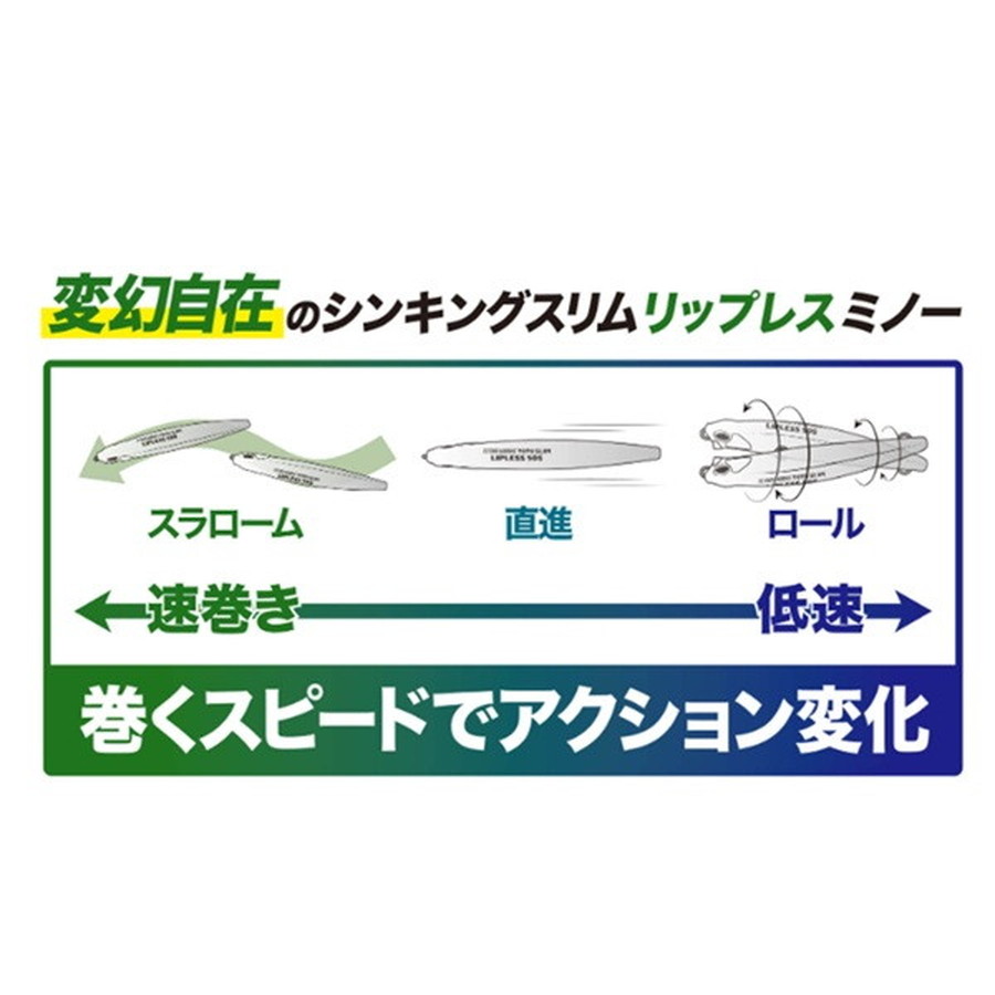 変幻自在のシンキングスリムリップレスミノー。デッドスローではメバルが好む微細なロールアクションで、しっかりと見せ喰わせることが出来る。リーリング速度を上げていくとスラロームアクションに移行し、ミディアムリトリーブではI字系として使用も可能となっている。メッキなどを狙う場合のファーストリトリーブでは、ベイトが逃げ惑うパニックアクションも巻きだけで演出が出来る。様々なターゲットが多いライトゲームにおいて、様々なアクションで誘える優秀なルアーとなってくれるだろう。