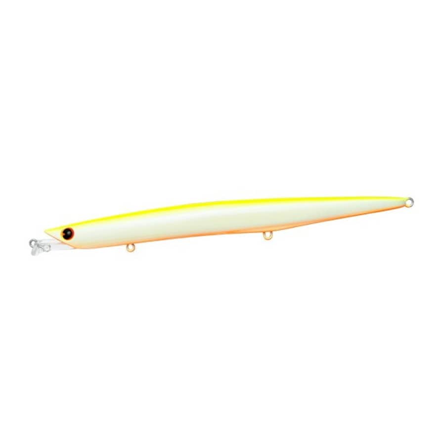 さらに遠くのシャローを責める、ビッグサイズフィネスミノー。オリジナルモデルの水面直下レンジキープ力と微弱ロールアクションを継承しながらサイズアップ。大きくなった分、巻き速度をあげた時のテールの振りは抑えるよう調整しました。また、後方に集中させたウェイト配置で、細身ミノーにありがちなキャスト時の横風の弱さも克服。大型ベイトパターンに限らず、ベイト過多などアピールを強めたいときにもおすすめです。