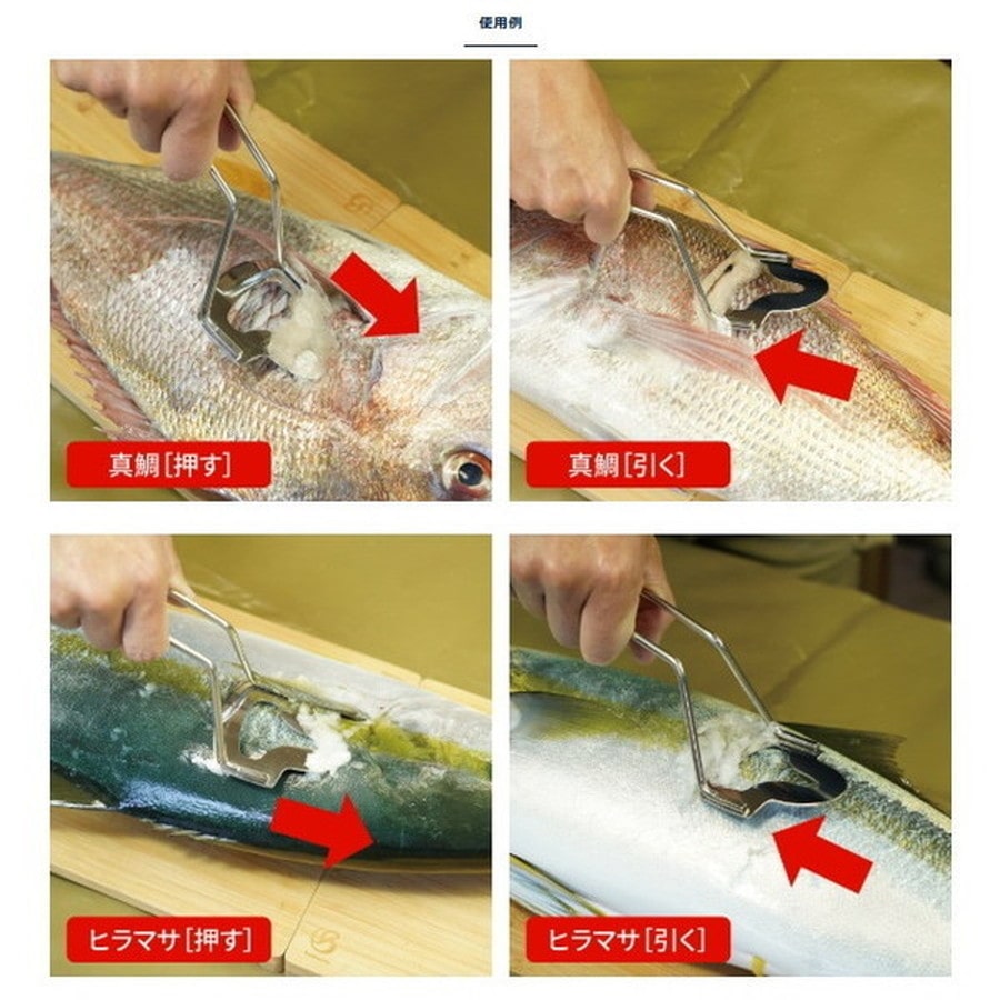 力が入りやすい引きと細かいヒレ周りは押しでウロコが取れる固定式。魚体に沿うアーチ型でウロコが取りやすく飛び散りにくい構造です。