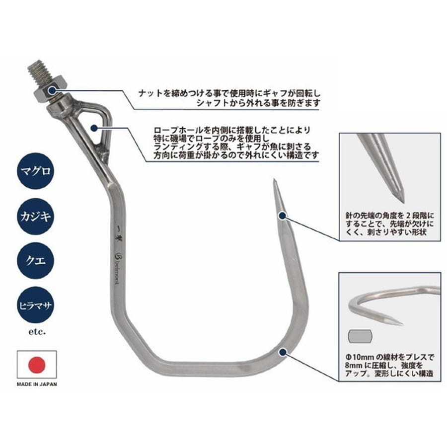 大型の魚に対応するビックゲームギャフ。★サイズ:約H275×W150mm、線径11×8mm、ネジ径/4分