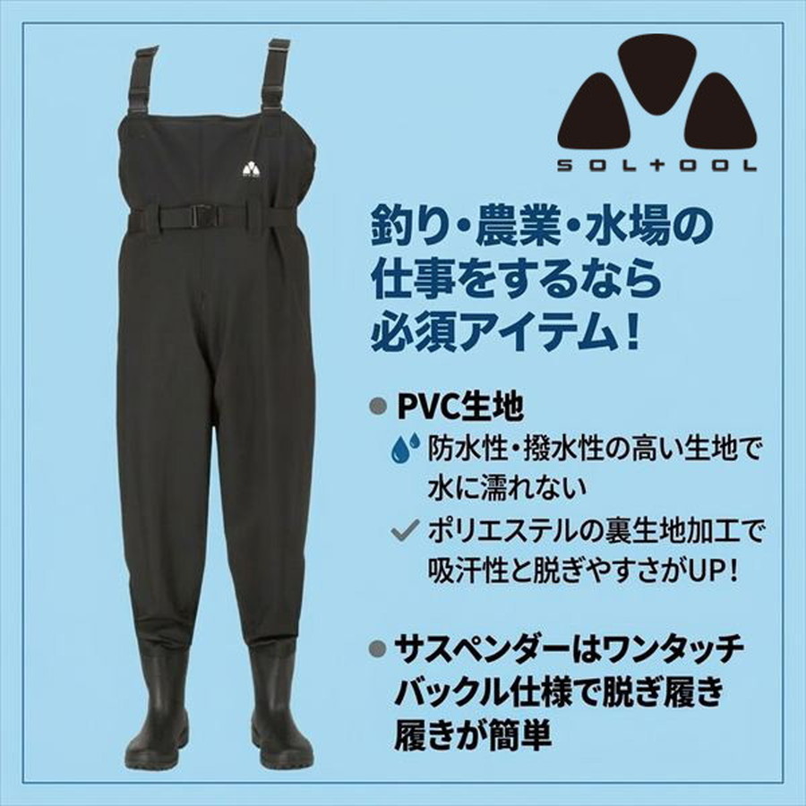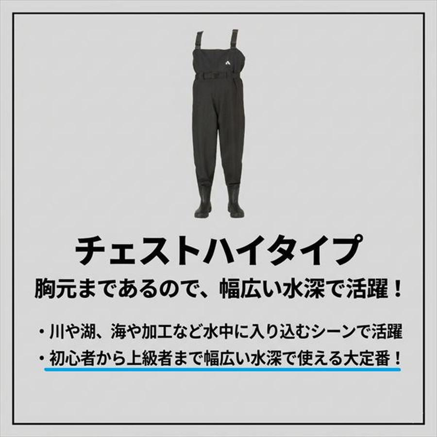 釣り・農業・水場の仕事をするなら必須アイテム!足から胸までを覆う部分に防水性・撥水性の高いPVC生地が使われており、防水性はバッチリ!!水漏れもしにくい加工方法で作られております。岸からでは不可能なキャストも水中に入り込んで、最適なコース・立ち位置でフィッシングを楽しめます。水に濡れないのはもちろん、ポリエステルの裏生地加工により吸汗性と脱ぎやすさがアップ。長靴部と胴付部の繋ぎ目は熱溶着加工されており高い防水性を保持します。渓流でのルアー釣りや、川釣り、潮干狩り、水産加工場、魚市場での現場作業着に、また、田植えや草刈りなど農作業や雪掻き、川掃除などなど、水場でのアクティブな動作ならウェーダーが必須です!!