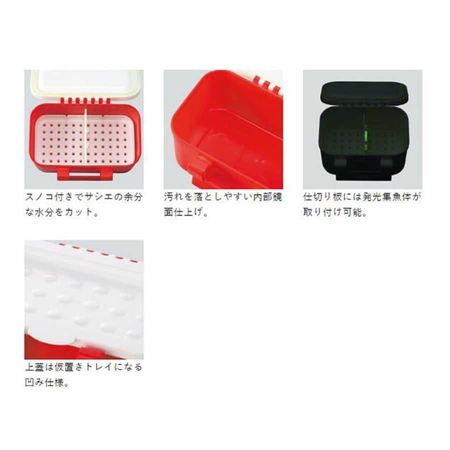 サイズ:<外寸>70×110×61mm/<内寸>65×105×30mm 素材:[本体]ポリプロピレン [フタ部分]ポリプロピレン [インナートレイ] ポリプロピレン ※掲載している商品の画像は代表画像を表示しています。また実物と色が違って見える場合があります。あらかじめご了承下さい。★●本体の密閉性を高めることで、集魚剤や集魚液をまぶして使用できます。●本体上部のトレーは凹んでおり、サシエを小出しにして使用できます。●内部の仕切りは取り外しが可能。●仕切り板には集魚発光体を取り付けることが可能です。※取付対応サイズはΦ 4.5 × 37mm ●底部は一体成型ボディ。●汚れが付きにくく、洗い落としやすい内部鏡面仕上げ。●丸洗いが可能な素材。