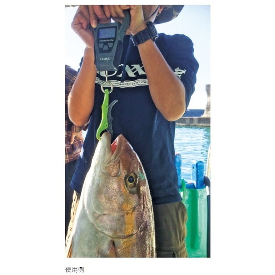 ・魚に優しい樹脂製グリップ。・電池交換用ドライバー。・簡易メジャー1m 付き。・計量範囲50g-50kg。・最小表示5g ・表記単位kg,lb,oz ・液晶バックライト。・オートオフ(60 秒)。・TARE(ゼロ設定) &ホールド機能。・水しぶきなどから内部を守る防滴仕様(IPX4)。※フィッシュグリップとカラビナの強度はMAX25㎏です。