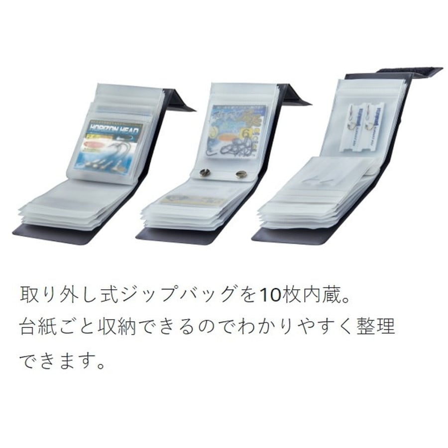 鈎や小物を取り出しやすくコンパクトに収納できるフックファイル。●バラ鈎や小型ジグヘッドなどの収納に最適なジップバッグを10枚内蔵。●ジップバッグは取り外し可能。台紙ごと収納できるサイズ設定で出し入れがスムーズ。●水やしぶきに強いP.V.C生地を使用。●水漏れから中身を守る簡易防水機能。★カラー:ブラック(蒲克) 素 材:(本体)P.V.C サイズ:(外寸)約D40×W80×H110mm、(インナージップバッグ内寸)約D80×W65mm ※実物と色が違って見える場合があります。あらかじめご了承下さい。