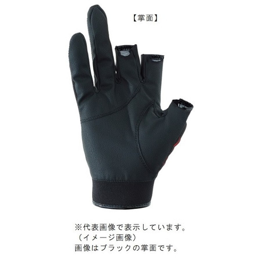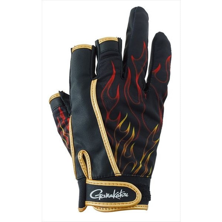 「渋派手」の炎デザインに注目。全方向にストレッチするグローブ。縦横斜めの全方向にストレッチする伸縮性生地を甲側に配置することで、優れたフィット感が特徴のグローブ。「渋派手」の炎デザインをプリント加工にし、面ファスナー採用でさらに疲れにくさやフィット感にこだわりました。また、ロッドや撒き餌杓などを握りやすいように3本切の指部分(掌側)をカーブ状に設計しています。★カラー:ゴールド サイズ:L タイプ:3本切 素材:(甲)ポリエステル87%、ポリウレタン13%、合成皮革(ポリウレタン65%、ナイロン35%)/(8掌)合成皮革(ポリウレタン65%、ナイロン35%)サイズ目安表 ※実物と色が違って見える場合があります。あらかじめご了承下さい。