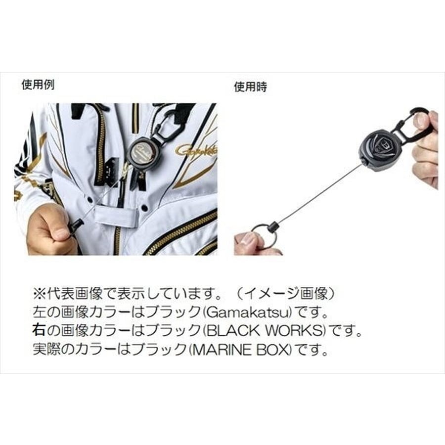 重い釣具も保持できるBIGピンオンリール。●強力な巻取りバネを装着することで、最大負荷重量約180gまでのものが保持できます。●接続部分をカラビナ機構にすることで、バッグ、ベルトループなどに簡単に着脱可能 釣りではもちろんキーホルダーやキーリングとして使用可能。ツールの紛失、落下防止に役立ちます。★カラー:ブラック(MARINE BOX) 素材:(本体)ABS樹脂 サイズ:(本体)(使用時)D15×W40×H130mm、(ワイヤー)約60cm 最大負荷重量:約180g