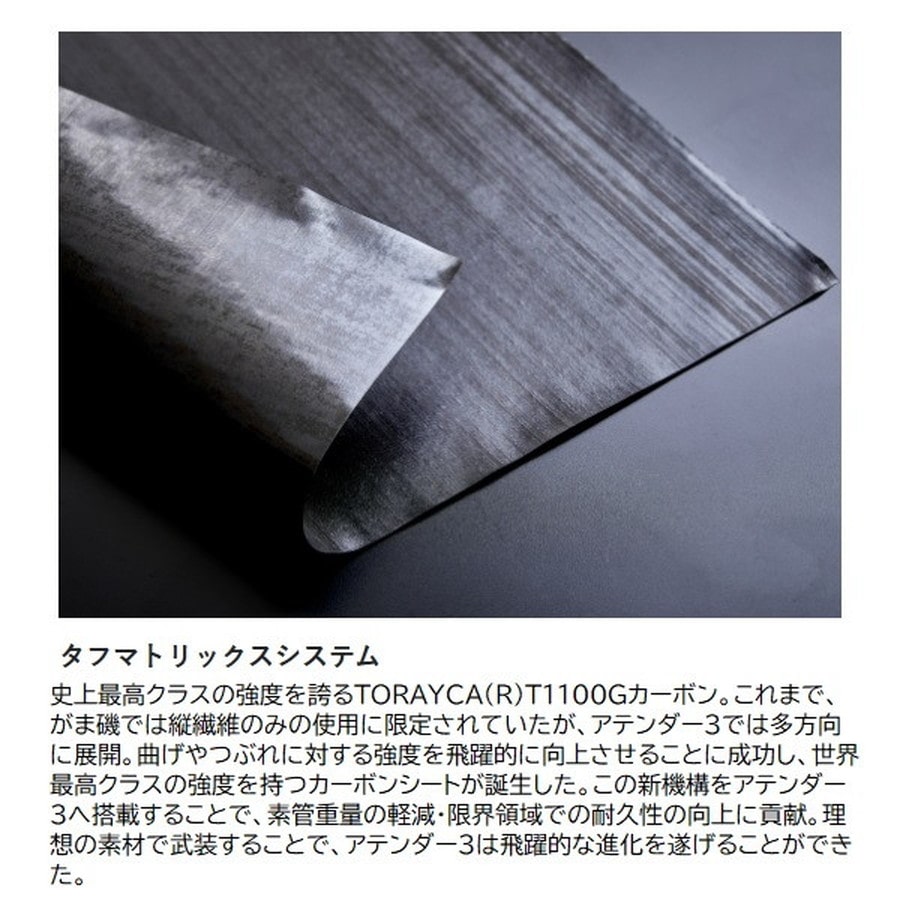 先進素材と新機構で伝説は新たなる次元へ。「対象魚をいかに楽に獲り込むか」。がま磯の真骨頂ともいえる「一定の竿角度でためているだけで、魚を浮かす」という設計思想をメインコンセプトに掲げ、3代目アテンダーは開発されました。ブランクには、更なる粘りとパワーを演出するため、ASD(アクティブサスデザイン)の究極進化系「ウルトラASD」を採用。スムーズな曲がりは細ハリスにもやさしく、繊細なアプローチでスレた魚も攻略できます。操作性を向上させるため、リールシートや、エンドグリップの形状を見直し、ホールド性の高いものを採用しました。さらに、先短設計を採用することで操作性を高めつつ、胴のパワーを瞬時に引き出すことが可能になりました。また、釣り場で竿を保持した際の持ち重りが低減するように重心の位置を最適化しています。様々な新要素を纏い、アテンダーが更なる進化を遂げました。