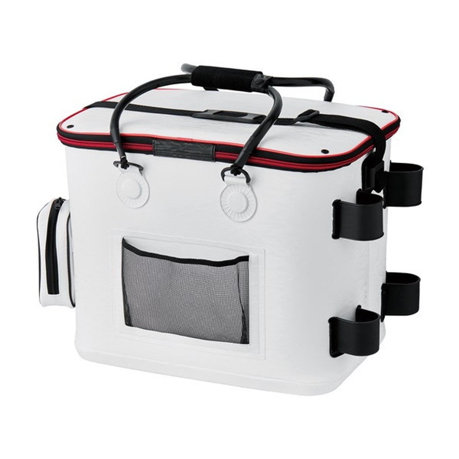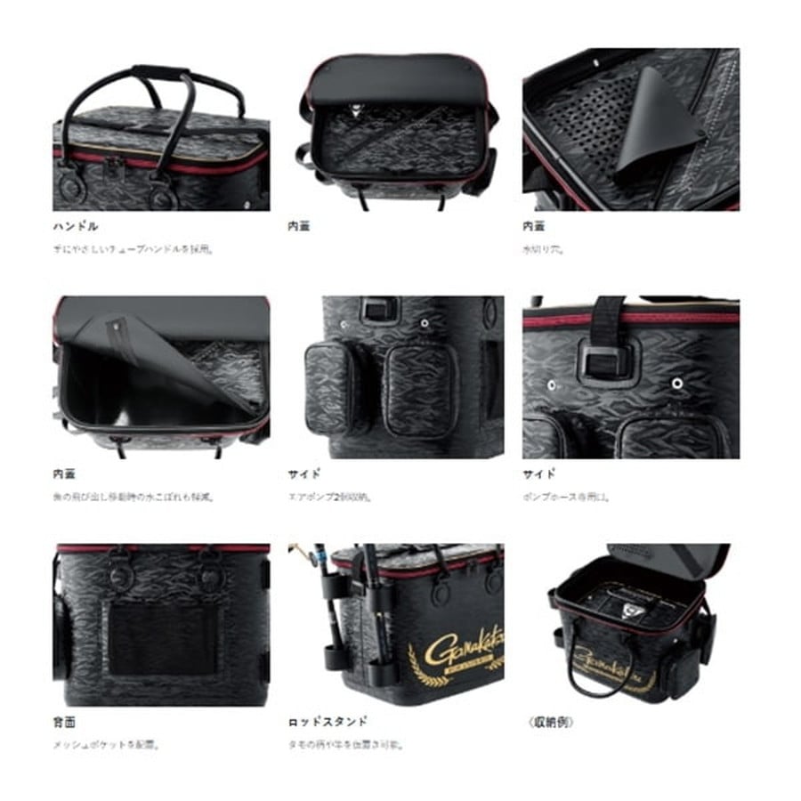 エアポンプが2個収納できるサイドポケットを装備。高い全高を生かし、バッカンを内部に入れた状態でも、上部に水汲みバケツなどの道具類や予備の集魚剤が仕舞えます。●手にやさしいチューブハンドルを採用。●バッカンを内部に収納しても、上部にスペースが出来るように設定しているため水汲みバケツなどの道具類や予備の集魚剤の収納が可能。●上蓋にはスナップボタンを配置し、全開と半開の2段階の開閉が可能。●内蓋を採用することで魚の飛び出しを防止。移動時の水のこぼれを抑制。●斜めのファスナーからスムーズな魚の投入が可能。水切り穴を採用し、魚を活かしたまま水換えをする際に便利。●タモの柄や竿を仮置きできるロッドスタンドを配置。●ポンプポケットはファスナー仕様でポンプをしっかりホールド可能。●ポケット下部にはハトメを設けることで、水が溜まるのを防ぎます。●ポンプホースは専用口を通して内部へ入れることが可能。●特殊エンボスシートを採用。★サイズ:D330×W500×H390mm