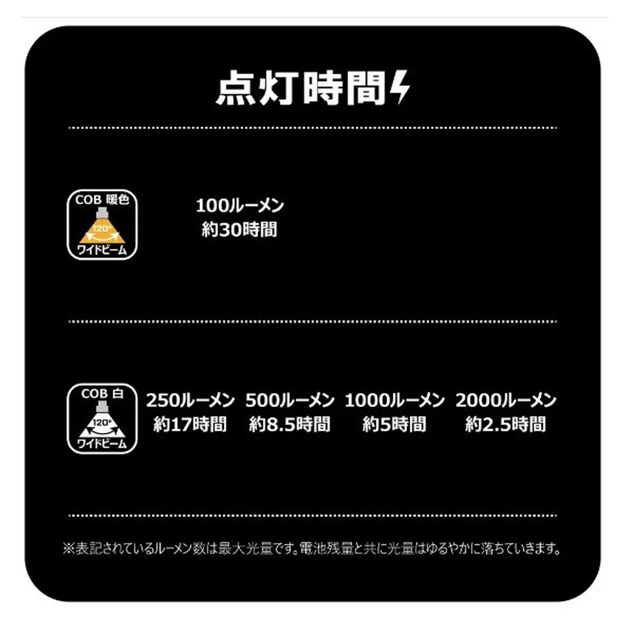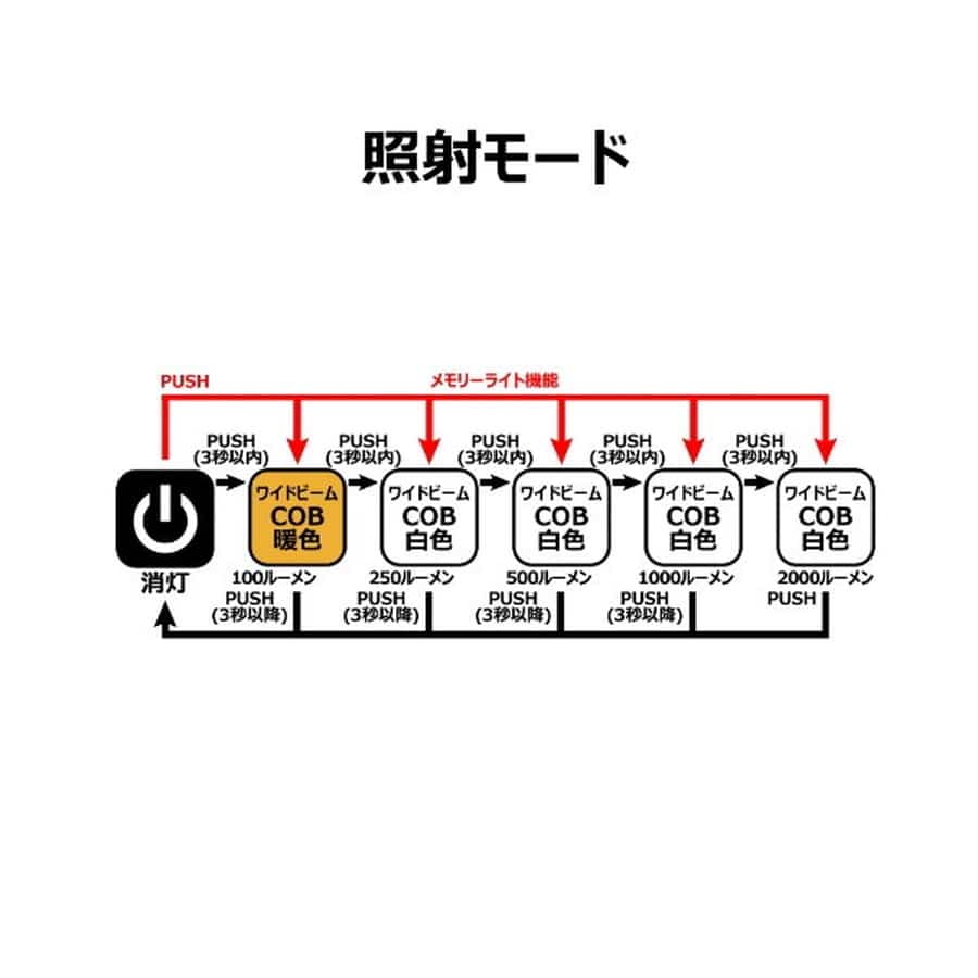 ●充電時間は5V 2A/約4時間。●IP65 防塵・防水仕様。●底面強力マグネット付き。●目に優しく色味が分かり釣行前準備に便利な暖色COBライト。●3秒以降に1回押せばオフになるクイックオフ機能。●前回使用のライトから点灯するメモリーライト機能。