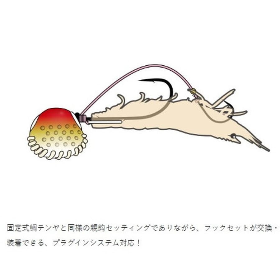 固定式鯛テンヤと同様の親鈎セッティングでありながら、フックセットが交換・装着できる、プラグインシステム対応!ソケットホールに差し込むと、固定式鯛テンヤと同様の鈎セッティングができます。フッキング後はシンカーから鈎が分離することで遊動式となり、バラシを軽減してくれます。※別売の桜幻 シンカーストッパー併用で固定力アップ!