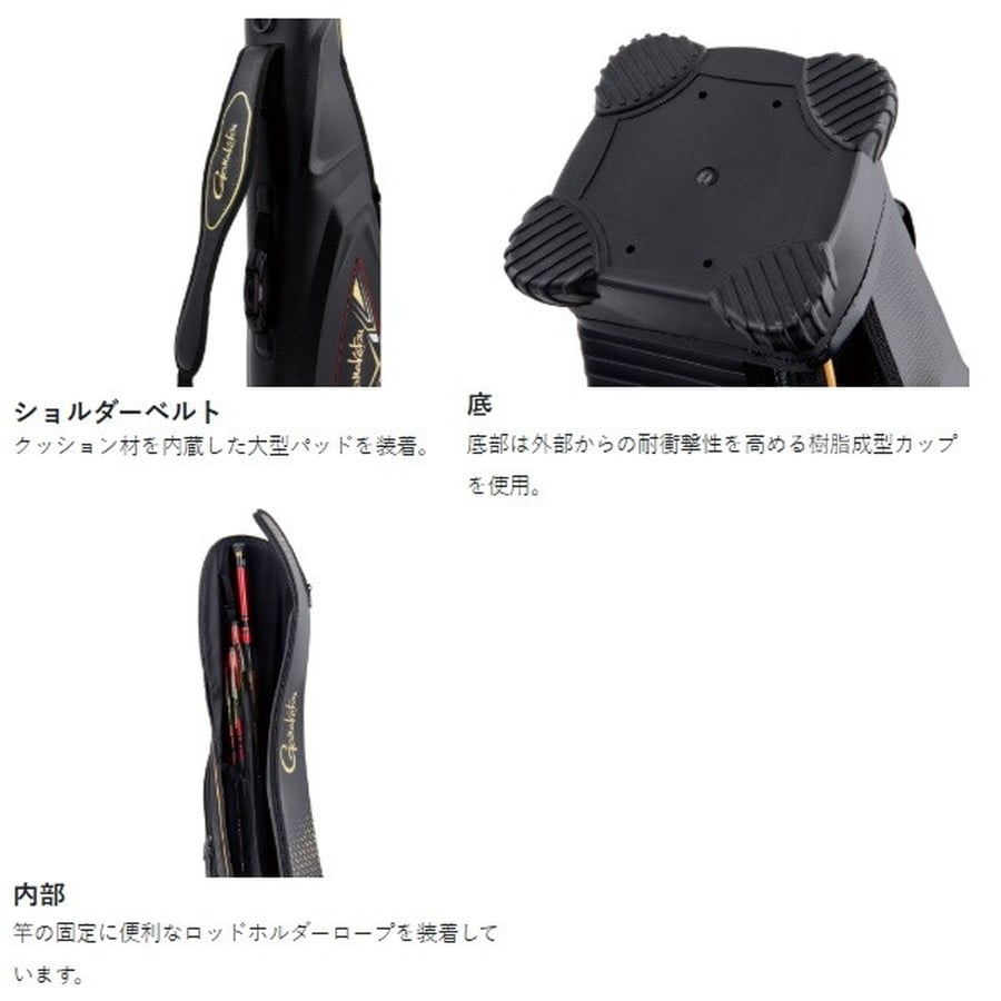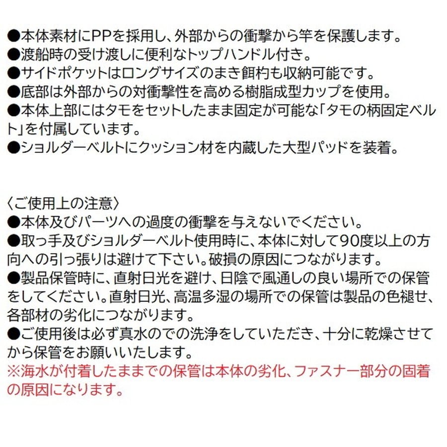 高い耐衝撃性を備えて軽量に仕上げたロッドケース。●本体素材にPPを採用し、外部からの衝撃から竿を保護します。●渡船時の受け渡しに便利なトップハンドル付き。●サイドポケットはロングサイズのまき餌杓も収納可能です。●底部は外部からの対衝撃性を高める樹脂成型カップを使用。●本体上部にはタモをセットしたまま固定が可能な「タモの柄固定ベルト」を付属しています。●ショルダーベルトにクッション材を内蔵した大型パッドを装着。