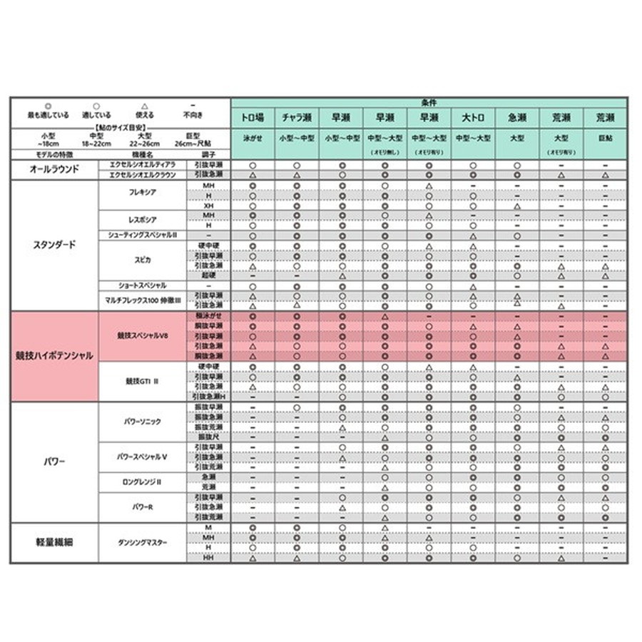 高強度高弾性カーボンTORAYCA(R)M40Xの採用で軽量化と破損防止を両立。標準穂先はカーボンチューブラーで、極泳がせと胴抜早瀬には繊細タイプ、引抜早瀬と引抜急瀬と胴抜急瀬には万能タイプのチタン替穂先、さらに初期の小型の時期や積極的にオトリを動かしたいときに最適なS3ソリッド替穂も全機種に付属。引抜急瀬・胴抜急瀬は軽量でねじれに強いPCS搭載で操作性と感度を強化。各モデルは繊細な泳がせ釣りに適した極泳がせ100から、大型鮎対応の引抜早瀬、急瀬対応の胴抜急瀬まで多彩にラインナップ。競技の新たな可能性を切り拓くため、すべての機種において、トーナメントシーンの最前線で活躍するがまかつテスター陣が調子設計にこだわり抜いた完成度の高い逸品です。ねじれに対して強化するため竿先に軽量化したPCSを搭載した上で、野鮎の引きを受け止める胴部分の90度(円環)方向の繊維量を強化。そのことで、大鮎とのやりとりの際でもしっかりと竿の反発力で対応することができます。卓越した瀬での操作性と感度により瀬釣りをより楽しめます。