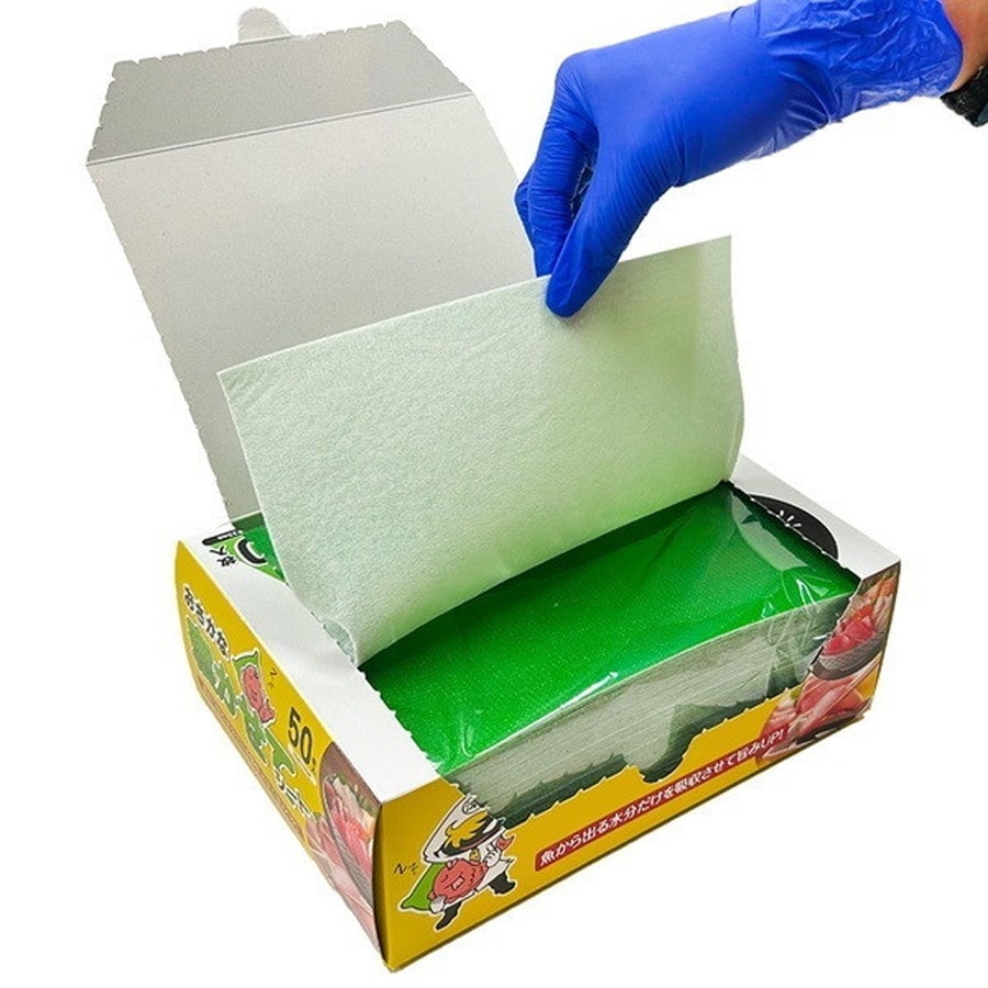 食品の保存・解凍時に出るドリップや水分を吸収する食品シート。ドリップを逆戻りさせない特殊構造で「鮮度」と「旨味」をキープ。さらに吸収したドリップの細菌増殖を抑制し、より衛生的に食品を保存。コンパクトで使いやすい化粧箱入りタイプ。