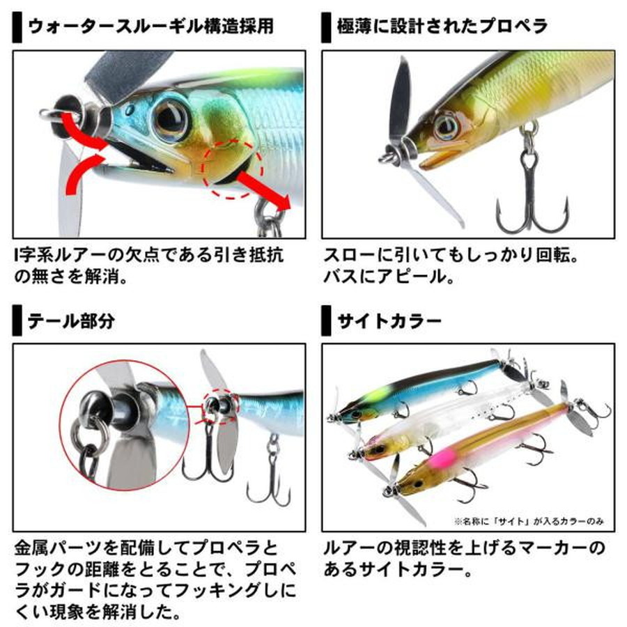 ウォータースルーギル構造搭載。投げて巻くだけのシンキングプロップベイト。※掲載している商品の画像は代表画像を表示しています。また実物と色が違って見える場合があります。あらかじめご了承下さい。