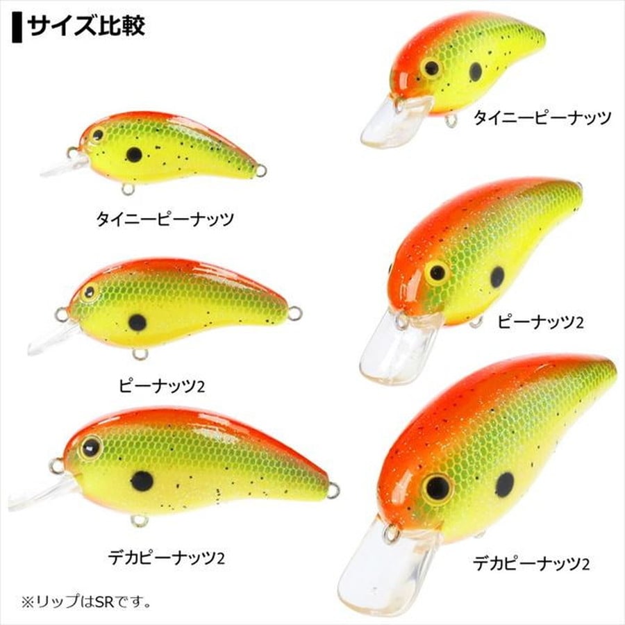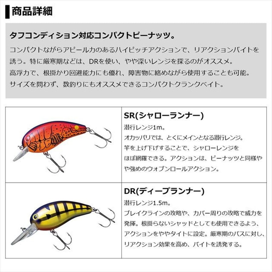 タフコンディション対応コンパクトピーナッツ。コンパクトながらアピール力のあるハイピッチアクションで、リアクションバイトを誘う。特に厳寒期などは、DRを使い、やや深いレンジを探るのがオススメ。高浮力で、根掛かり回避能力にも優れ、障害物に絡めながら使用することも可能。サイズを問わず、数釣りにもオススメできるコンパクトクランクベイト。●SR 特徴 潜行レンジ1m。オカッパリでは、とくにメインとなる潜行レンジ。竿を上げ下げすることで、シャローレンジをほぼ網羅できる。アクションは、ピーナッツと同様やや強めのウォブンロールアクション。