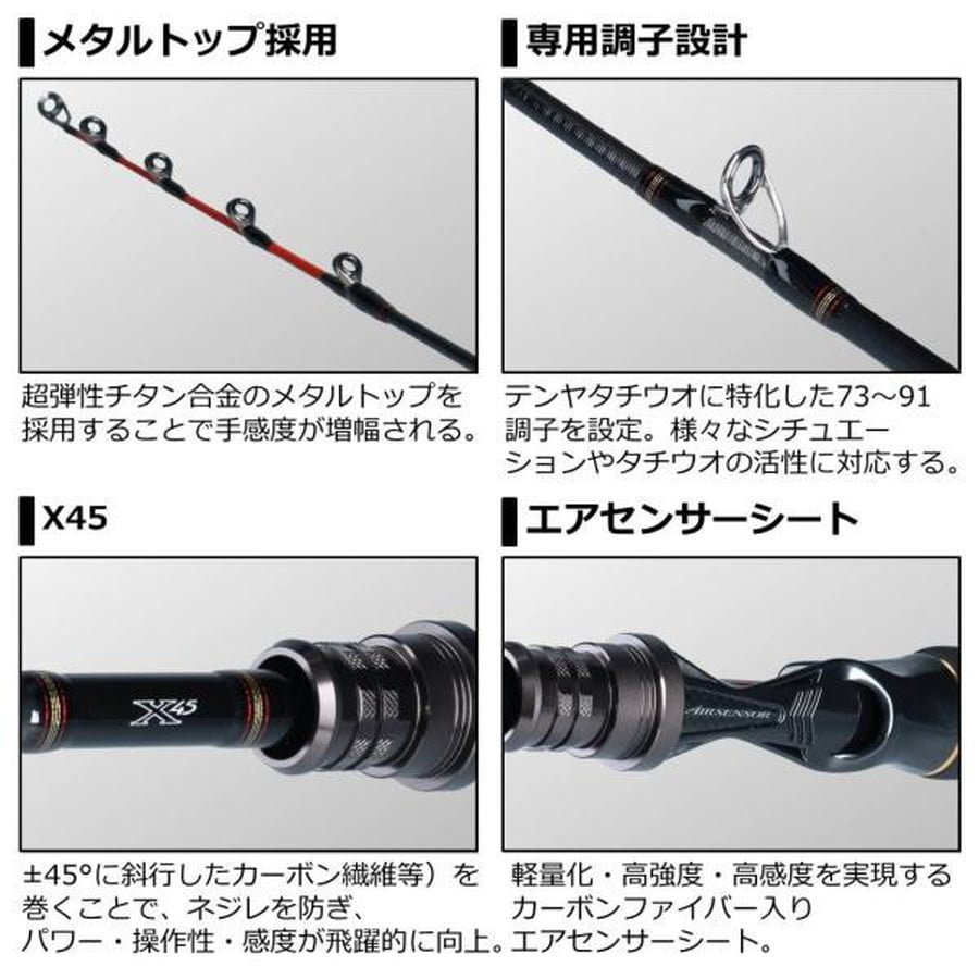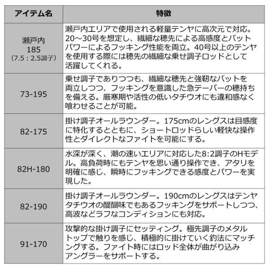 メタルトップの感度が光るテンヤタチウオ専用ロッドの王道! ■82H-180・・・水深が深く、潮の早いエリアに対応した8:2調子のHモデル。豊後水道に代表される50号のテンヤを使用するエリアはが水深が深く、潮が早い。そのような高負荷時にもテンヤを思い通り操作でき、アタリを明確に感じ、瞬時にフッキングできる感度とパワーを実現した。180cmのレングスは長時間のやり取りでもアングラーの負荷を軽減し、快適なやり取りを可能にしてくれる。40号テンヤの使用時はより攻撃的なフッキングを可能にし、さらに80号のテンヤまで高次元に対応。(2020年発売モデル)※掲載している商品の画像は代表画像を表示しています。また実物と色が違って見える場合があります。あらかじめご了承下さい。