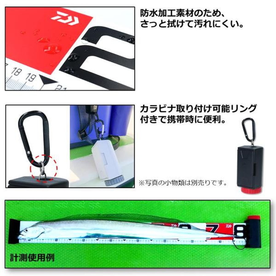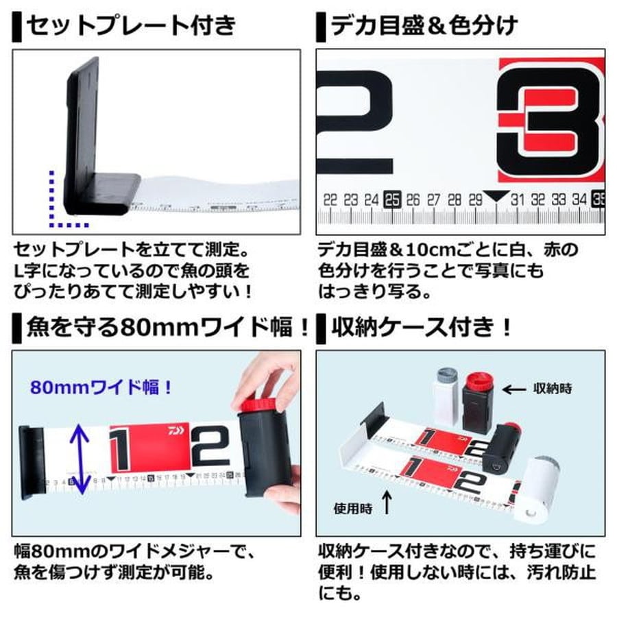 サイズ:80★収納ケース付きのフィッシングメジャー ■魚の頭を当てて測定しやすいセットプレート付き ■写真がはっきり写るデカ目盛&10cmごとの白/赤色分け ■幅80mmワイドメジャーで魚を守る※掲載している商品の画像は代表画像を表示しています。また実物と色が違って見える場合があります。あらかじめご了承下さい。