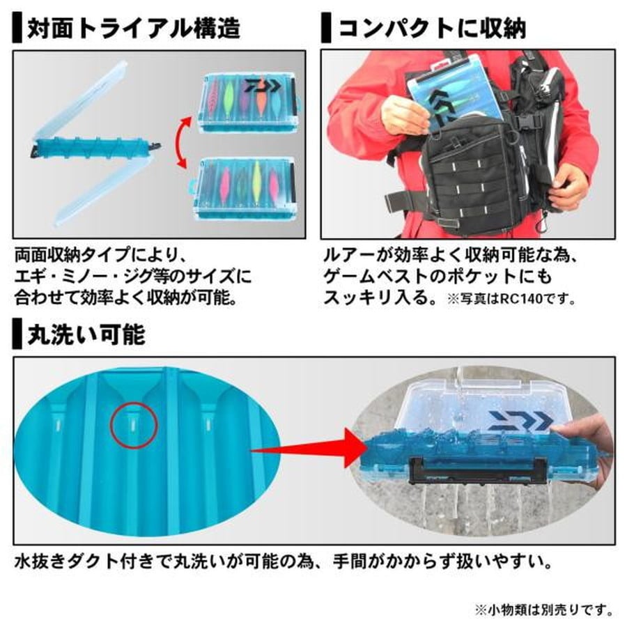 エギ・ミノー・ジグ等が効率よく収納可能。両面収納タイプ。水抜きダクト付きで丸洗いが可能なため、手間がかからず扱いやすい。