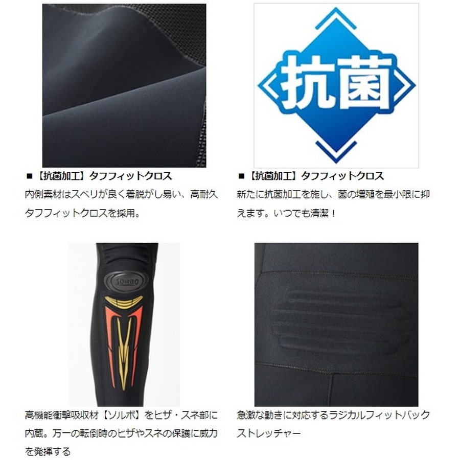 内側素材はスベリが良く着脱がし易い、高耐久タフフィットクロスを採用。新たに抗菌加工を施し、菌の増殖を最小限に抑えいつでも清潔!股上の設計を一から見直し、立ち込みが更に快適に。サイズラインナップが更に充実。待望のSA/LXOサイズ追加ラインナップ。高機能衝撃吸収材ソルボをヒザ・スネ部に内蔵。万一の転倒時のヒザやスネの保護に威力を発揮。着座姿勢でもシューズ・タビの脱ぎ履きがし易い足首内側サイドファスナー仕様。機動性と保温性を兼ね備えた2.5mm厚クロロプレン。急激な動きに対応するラジカルフィットバックストレッチャー/ラジカルフィットヒザストレッチャー。流水抵抗を抑えた3Dタイトフィット裁断。ズリ落ち防止のシャークスキン。立ち込みに有利なハイバックカット。小用事に便利なダブルロングファスナー。足首をまとめるダブル面ファスナーストラップ。干す際に便利なハンガーストラップ。日本製。★カラー:ブラック サイズ:MB ※実物と色が違って見える場合があります。あらかじめご了承下さい。