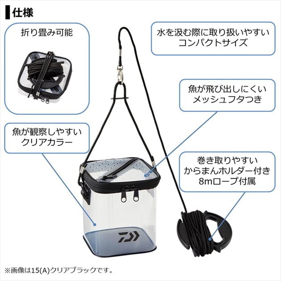 持ち運びに便利なコンパクトタイプ!■魚が飛び出しにくいメッシュフタつき ■水を汲む際に取り扱いやすいコンパクトサイズ ■魚が観察しやすいクリアカラー ■折り畳み可能 ■巻き取りやすいからまんホルダー付き8mロープ付属★サイズ:15(本体部外寸 約15×15×18cm) ※実物と色が違って見える場合があります。あらかじめご了承下さい。