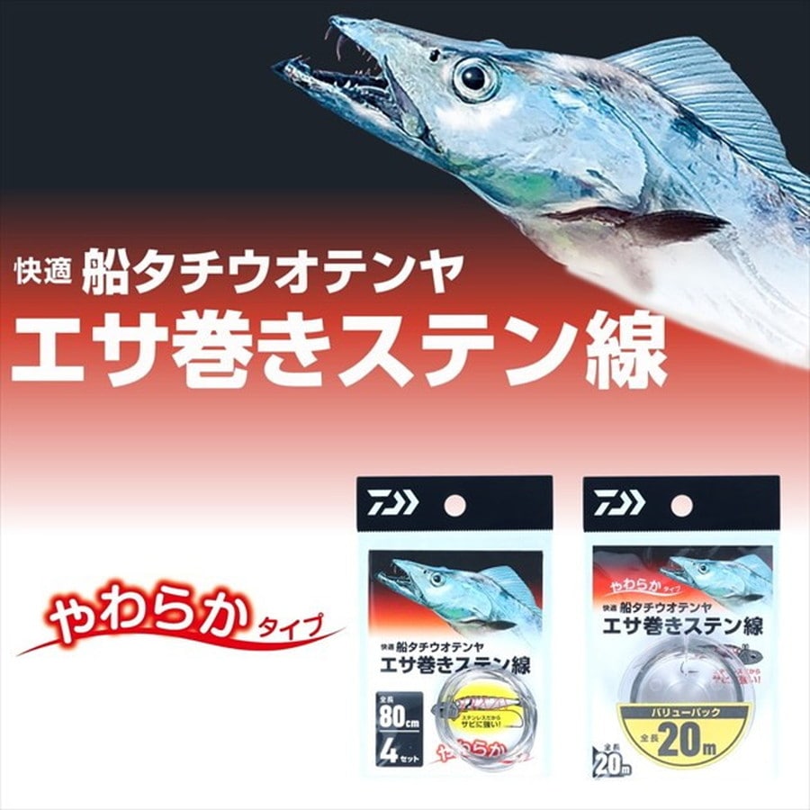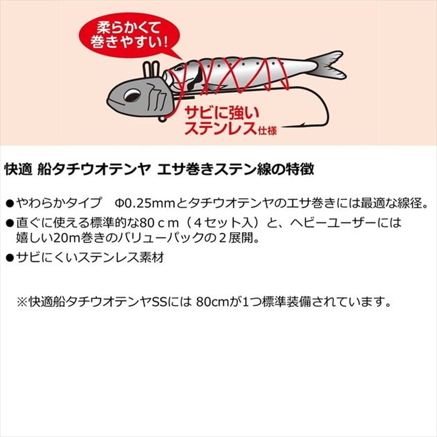 やわらかタイプでエサ巻きしやすいタチウオテンヤ専用設計 ■やわらかタイプΦ0.25mmとタチウオテンヤのエサ巻きには最適な線径 ■直ぐに使える標準的な80cm(4セット入)■サビにくいステンレス素材