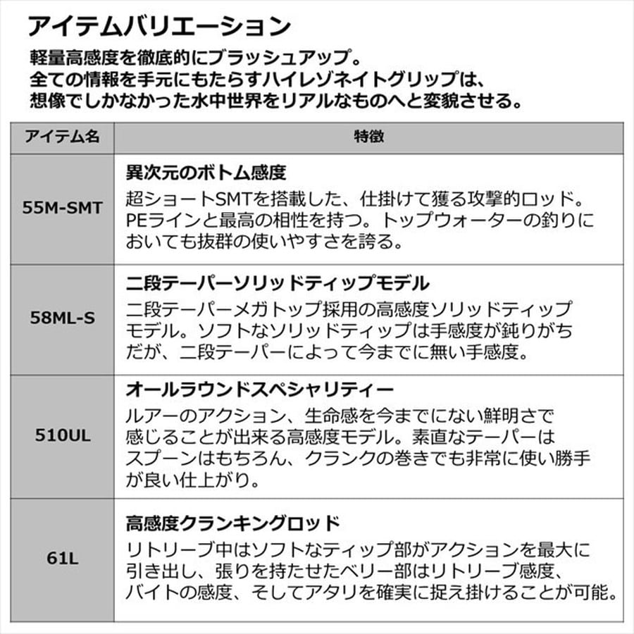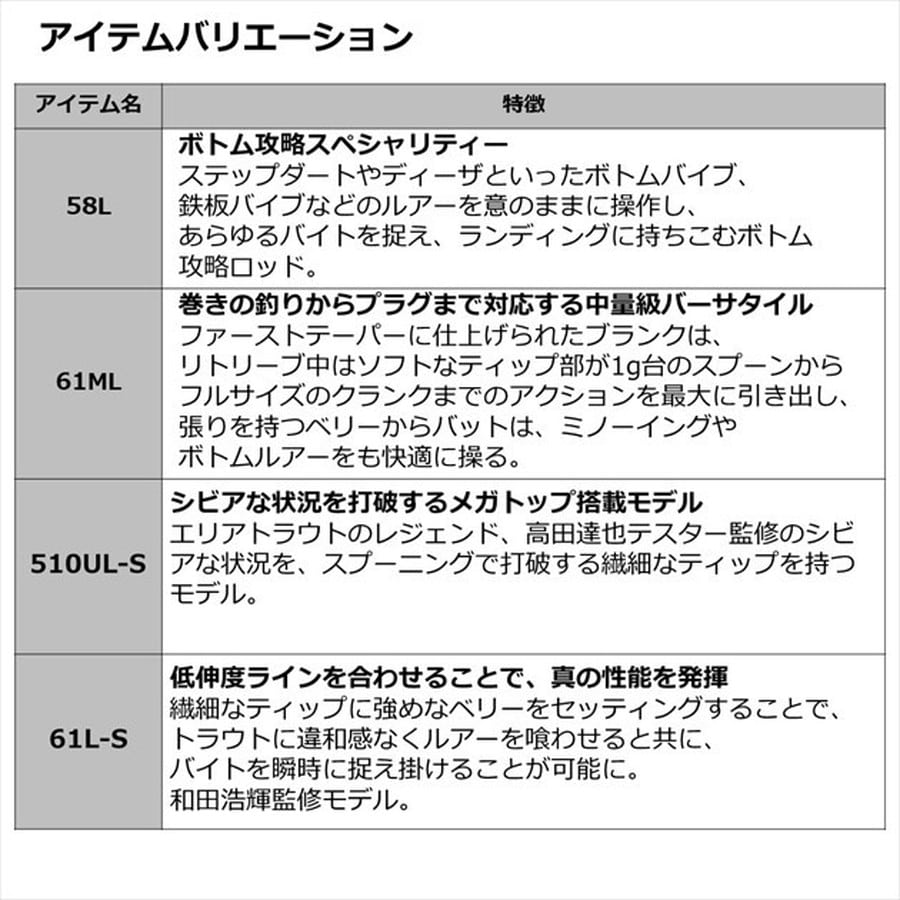 研ぎ澄まされた感度、突き詰めた軽量性がもたらす領域。軽量高感度を徹底的にブラッシュアップ。全ての情報を手元にもたらすハイレゾネイトグリップは、想像でしかなかった水中世界をリアルなものへと変貌させる。■61L-S・・・低伸度ラインを合わせることで、真の性能を発揮。繊細なティップに強めなベリーをセッティングすることで、トラウトに違和感なくルアーを喰わせると共に、バイトを瞬時に捉え掛けることが可能に。和田浩輝監修モデル。 ★全長:1.85m 継数:2 仕舞寸法:99cm 自重:66g 先径/元径:0.8mm/6.8mm ルアー重量:0.6-4g 適合ライン ナイロン:1.5-4lb カーボン含有率:99% ※実物と色が違って見える場合があります。あらかじめご了承下さい。