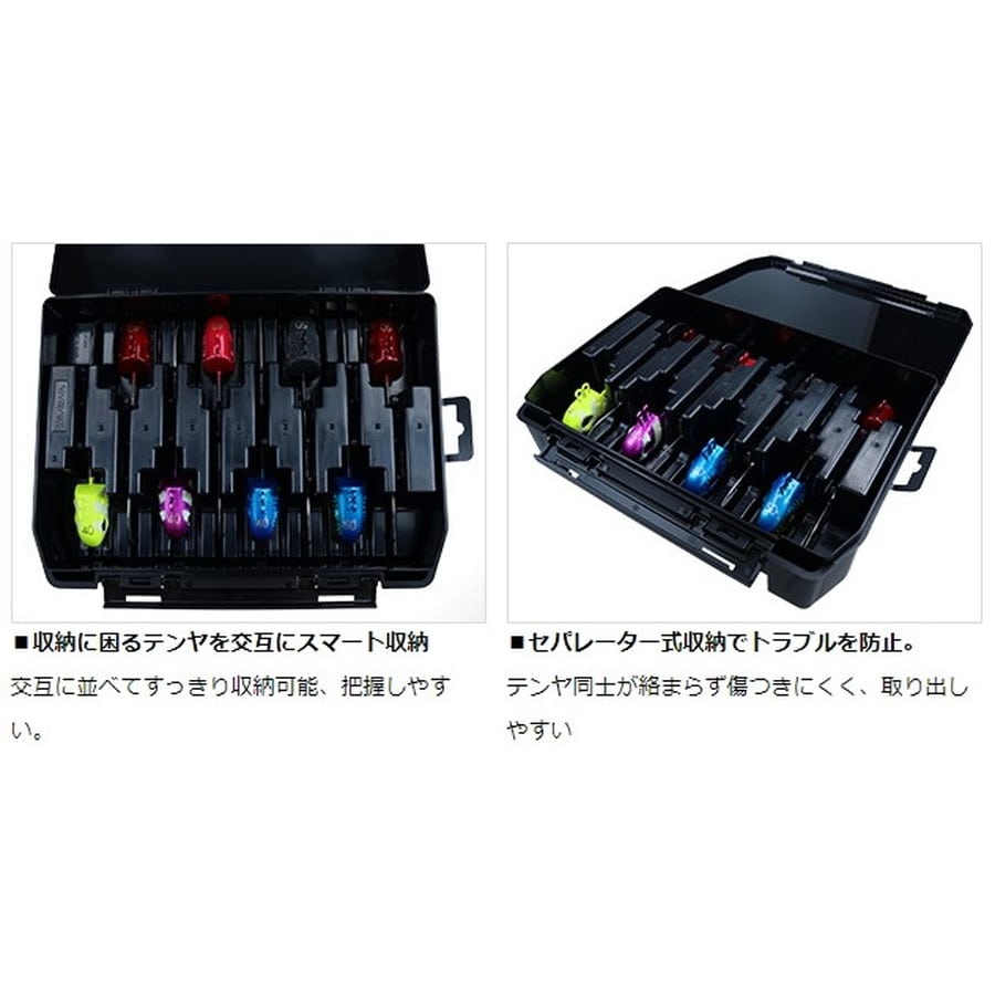 タチウオテンヤをスッキリスマートに収納。船で使用するタチウオテンヤ専用収納ケース。ケース内で転がったり傷ついたりして収納に困りがちなテンヤをスマートに収納。仕切り付き専用トレイにより30号-50号のテンヤを交互に並べて8本収納可能。平行に並ぶことでカラーやサイズが一目で分かり、取り出しやすい構造。一体式バックル採用により開閉がスムーズに行なえ、本体側面のバランススタンドにより縦置きで自立可能。TBタックルボックスにジャストサイズで収納可能。★カラー:ブルー サイズ:255×190×60mm ※実物と色が違って見える場合があります。あらかじめご了承下さい。