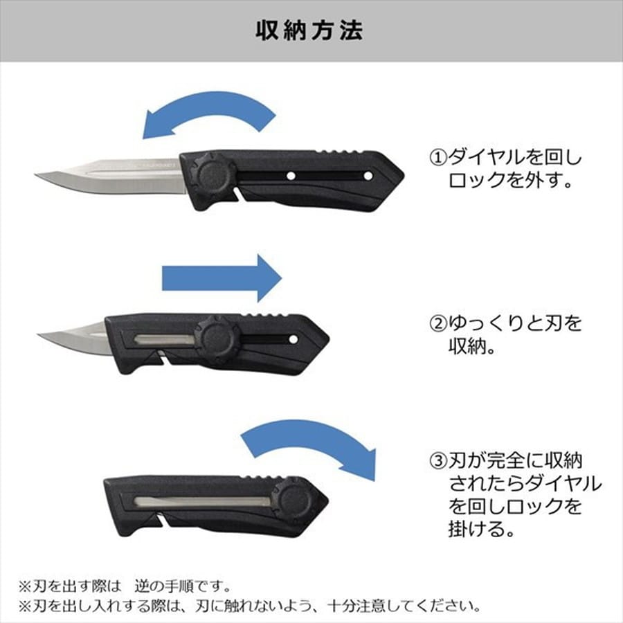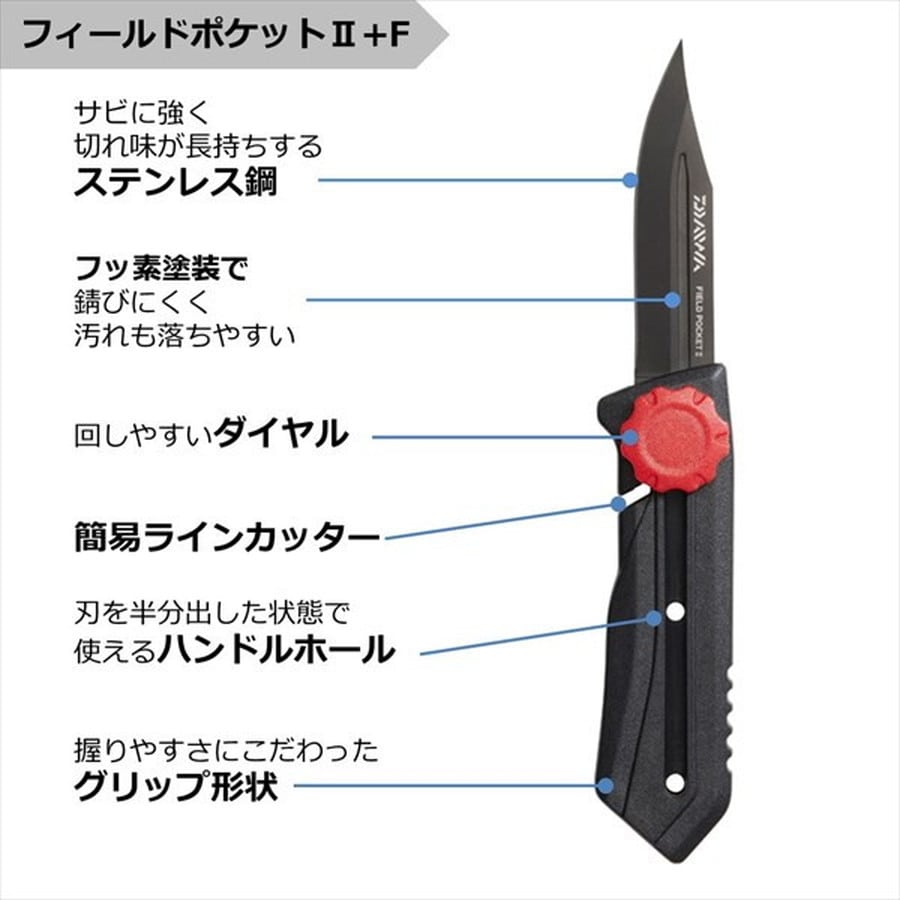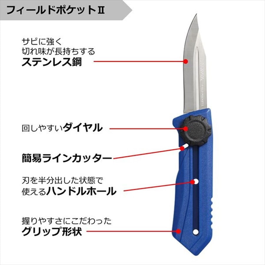 ポケットサイズの小型軽量ナイフの決定版。大好評フィールドポケットが進化して再登場。■自重約40g。ポケットサイズの小型軽量ナイフ。■刃をダイヤルスライド式で出し入れ可能。■刃がグリップ内に収納されることで、持ち運び時も安心。■刃素材:錆に強く切れ味が長持ちするステンレス製。■握りやすさにこだわったグリップ形状。■ナイロン・フロロ対応簡易ラインカッター付き。★自重:40g 全長:約180mm 刃渡り:約75mm 収納時サイズ:約110mm 素材:ステンレス