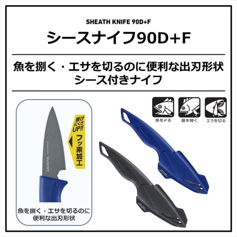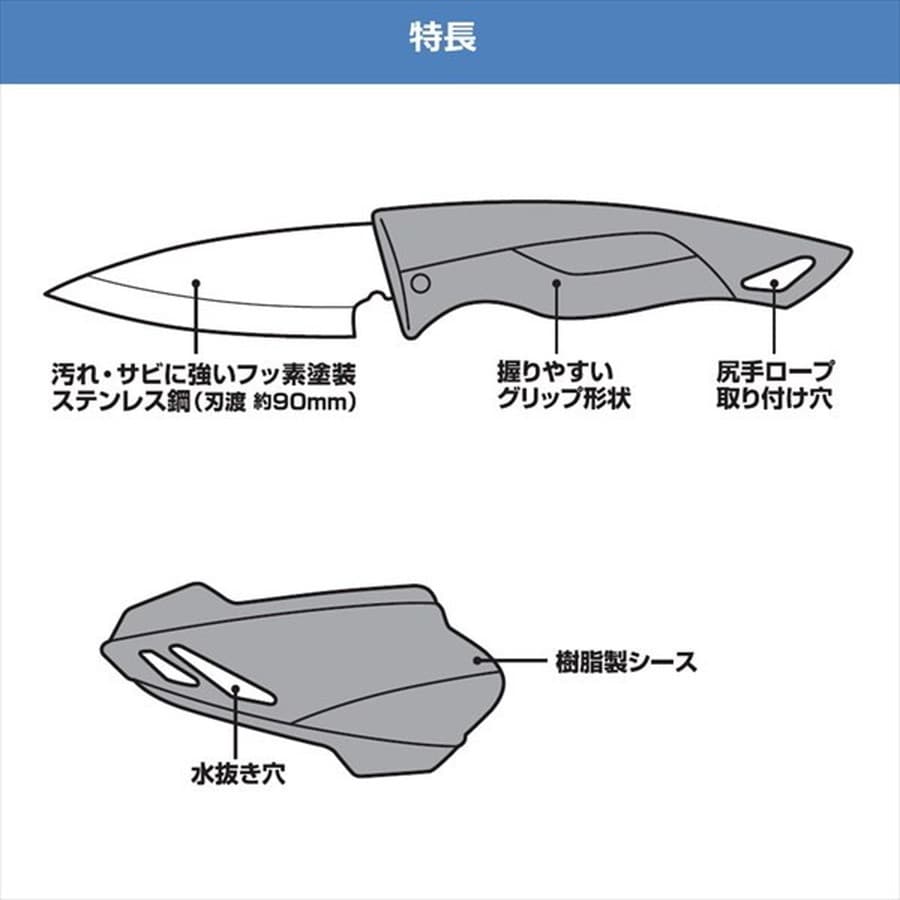魚を捌く・エサを切るのに便利な出刃形状 シース付きナイフ ■魚を捌く・エサを切るのに便利な出刃形状。■力を入れやすいグリップ形状。■カチッと着脱可能なシース付き。■シースは水抜き穴付きでお手入れもラクラク。■刃にはフッ素塗装を施し錆びにくく汚れも落ちやすい。