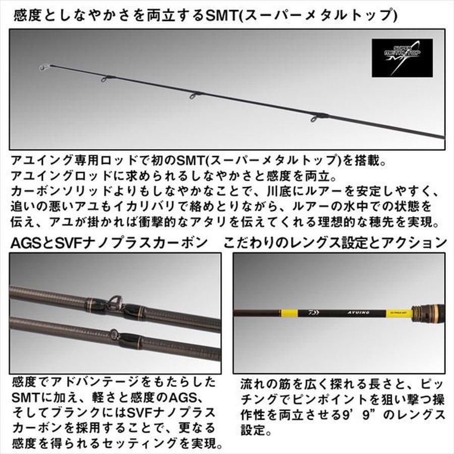 「軽さと感度」が創造するアユイングの新展開。アユイングロッドの最高峰EXモデル登場!進化を続けるアユイングの各種メソッドを高次元で実現するアユイング専用ロッドの最高峰。より多くのアユを「追わせて掛ける」ために必要とされる操作性と感度にこだわり、ダイワの最新テクノロジーを結集。特に感度に関しては水中のルアーの動きを逐一感じることでより繊細かつ大胆な攻めを可能とし、アユが掛かった時の大音量のアタリ感度はアユイングの新たな発見を与えてくれる。