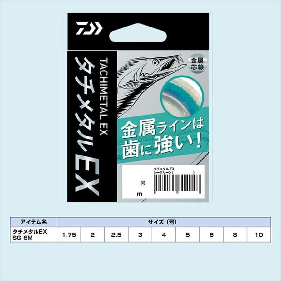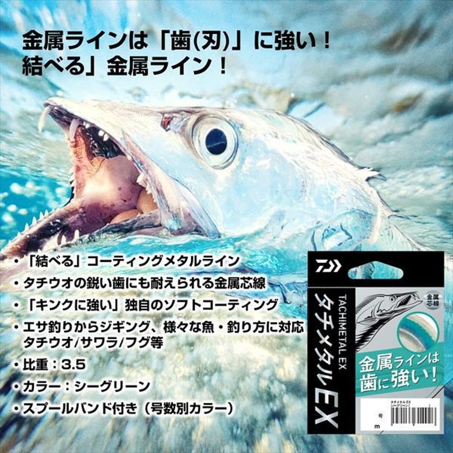 金属ラインは「歯(刃)」に強い!「結べる」金属ライン。コーティングメタルライン。タチウオの鋭い歯にも耐えられる金属芯線。「キンクに強い」独自のソフトコーティング。エサ釣りからジギング、様々な魚・釣り方に対応。(タチウオ/サワラ/フグ等)比重:3.5
