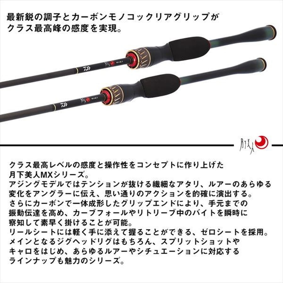 最新鋭の調子とカーボンモノコックリアグリップがクラス最高峰の感度を実現。クラス最高レベルの感度と操作性をコンセプトに作り上げた月下美人MXシリーズ。アジングロッドとして専用設計されたブランクは上位機種のノウハウを取り入れることで高感度かつ細身化を実現。テンションが抜ける繊細なアタリを伝達し、ルアーのあらゆる変化をアングラーに伝え、思い通りのアクションを的確に演出する。さらにカーボンで一体成形したグリップエンドにより、手元までの振動伝達を高め、カーブフォールやリトリーブ中のバイトを瞬時に察知して素早く掛けることが可能。リールシートには軽く手に添えて握ることができる、ゼロシート コンパクトフィットを採用。メインとなるジグヘッドリグはもちろん、スプリットショットやキャロをはじめ、あらゆるルアーやシチュエーションに対応するラインナップも魅力のシリーズ。