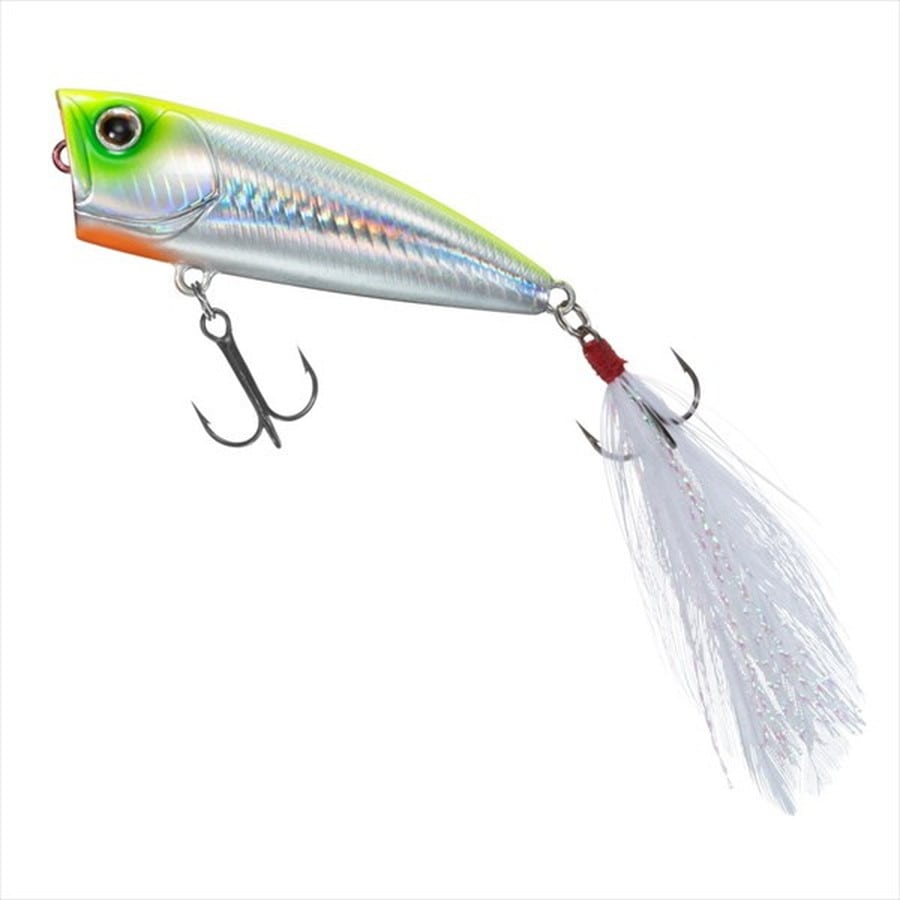 フロロカーボンラインでの使用を前提に開発されたハイパフォーマンスポッパー。多くのトップウォータープラグには、比重が軽く水に浮くナイロンラインやPEラインを使うことが推奨されており、きちんとアクションをつけるにはそれがほぼ必須の条件になっています。しかしながら持ち歩けるタックル数に限りがあるオカッパリや、極力ロッドの本数を減らしたいスモールボートでの釣行時には、トップウォーター用というだけでもうワンタックルを追加で準備することが困難な場合もあります。スティーズポッパーはその浮力やバランス、アクションを調整し、現在のバスフィッシングにおいて主流といえる「フロロカーボンライン」での使用を前提として開発された、数少ないバーサタイル系タックル対応型のポッパーといえます。最小サイズの50F(全長50mm)は、野池や小規模河川などのスモールベイトや虫パターンに対応。