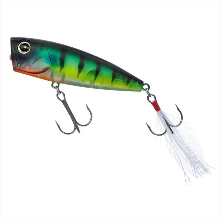 フロロカーボンラインでの使用を前提に開発されたハイパフォーマンスポッパー。多くのトップウォータープラグには、比重が軽く水に浮くナイロンラインやPEラインを使うことが推奨されており、きちんとアクションをつけるにはそれがほぼ必須の条件になっています。しかしながら持ち歩けるタックル数に限りがあるオカッパリや、極力ロッドの本数を減らしたいスモールボートでの釣行時には、トップウォーター用というだけでもうワンタックルを追加で準備することが困難な場合もあります。スティーズポッパーはその浮力やバランス、アクションを調整し、現在のバスフィッシングにおいて主流といえる「フロロカーボンライン」での使用を前提として開発された、数少ないバーサタイル系タックル対応型のポッパーといえます。最大サイズの70F(全長70mm)は、ベイトフィッシュのサイズが大きい時や、やや濁りが入った時、広範囲を探りたい時、深いレンジからバスを浮かせる必要があるときなどに最適です。