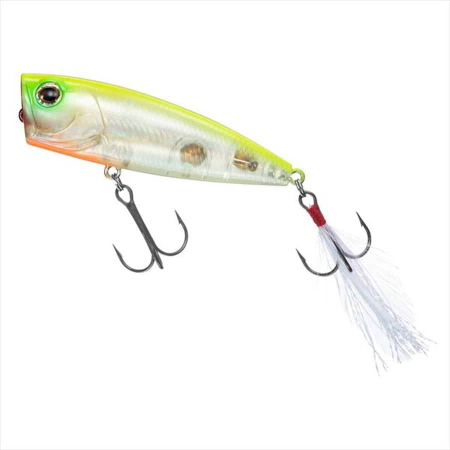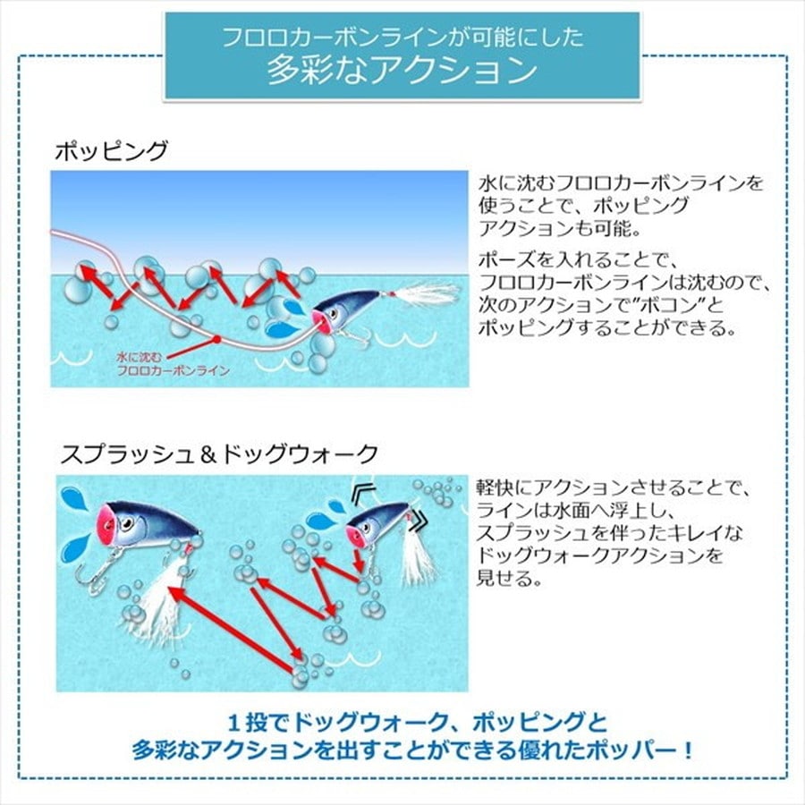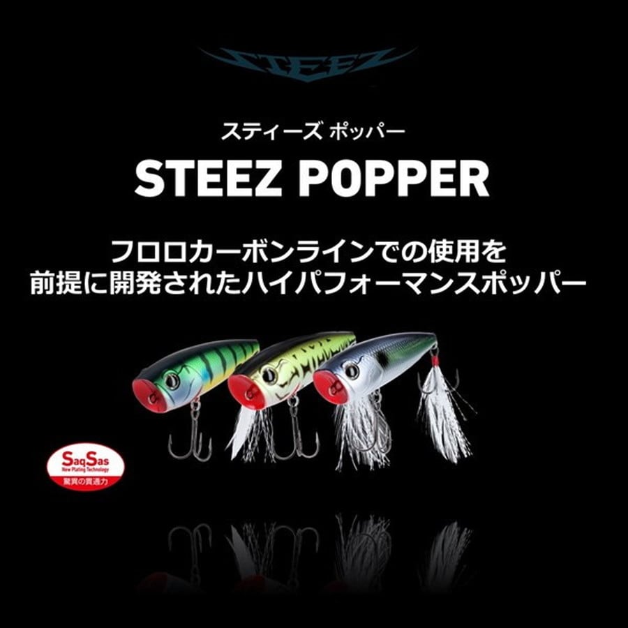 フロロカーボンラインでの使用を前提に開発されたハイパフォーマンスポッパー。多くのトップウォータープラグには、比重が軽く水に浮くナイロンラインやPEラインを使うことが推奨されており、きちんとアクションをつけるにはそれがほぼ必須の条件になっています。しかしながら持ち歩けるタックル数に限りがあるオカッパリや、極力ロッドの本数を減らしたいスモールボートでの釣行時には、トップウォーター用というだけでもうワンタックルを追加で準備することが困難な場合もあります。スティーズポッパーはその浮力やバランス、アクションを調整し、現在のバスフィッシングにおいて主流といえる「フロロカーボンライン」での使用を前提として開発された、数少ないバーサタイル系タックル対応型のポッパーといえます。最大サイズの70F(全長70mm)は、ベイトフィッシュのサイズが大きい時や、やや濁りが入った時、広範囲を探りたい時、深いレンジからバスを浮かせる必要があるときなどに最適です。