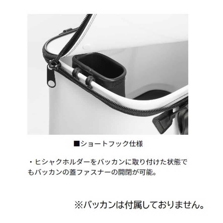 バッカンに取り付けてヒシャクを立てられる基本性能!!新形状のフックを採用したことで、バッカン等への装着時の固定力が向上。付けたままバッカンのファスナー開閉可能なショートフック仕様、ヒシャクの出し入れがしやすい傾斜付きの開口部、ヒシャクを入れても倒れにくい台形形状を採用。更には、コマセに入れる水の量が簡易的に量れるメモリも付いたヒシャクボルダー。