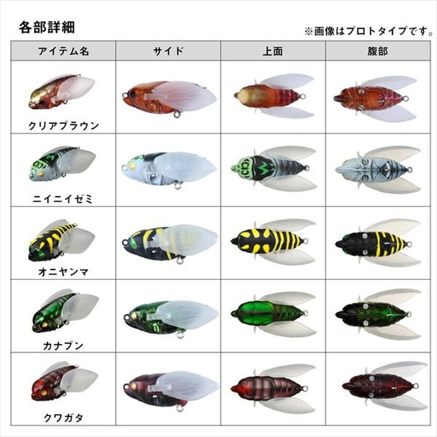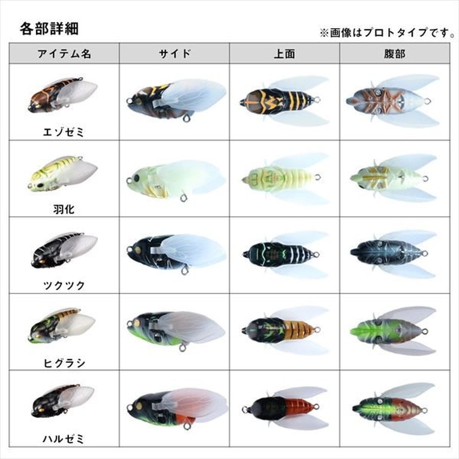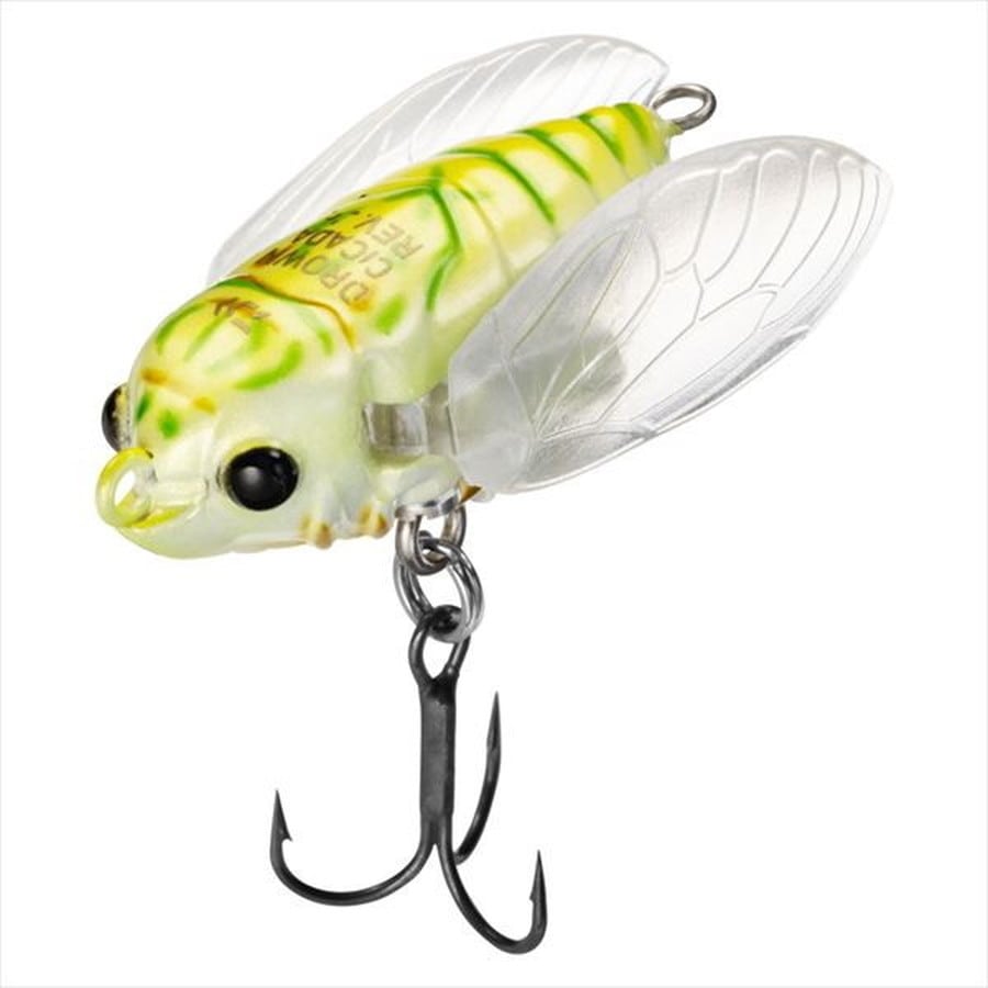 自動で閉じる羽根が弱ったセミを演出(ドラウンシケーダREV)。弱って水に落ちたセミの羽根は閉じた姿勢でいることに注目。羽根にバネ機構をもたせることでアクション後も閉じた姿勢をキープ。キャスト時に羽根が開きにくく、安定した飛行姿勢でよく飛ぶ。リトリーブ時は羽根が開いてパタパタアクション、フッキングを向上させる2フック仕様。脅威の貫通力を持つサクサスフックの色はセミの足のようにも見え、ナチュラルさを演出。また、横風を受けても流され難いような浮力に調整。シルエット、パーツ、アクションを進化させたセミルアーが誕生。