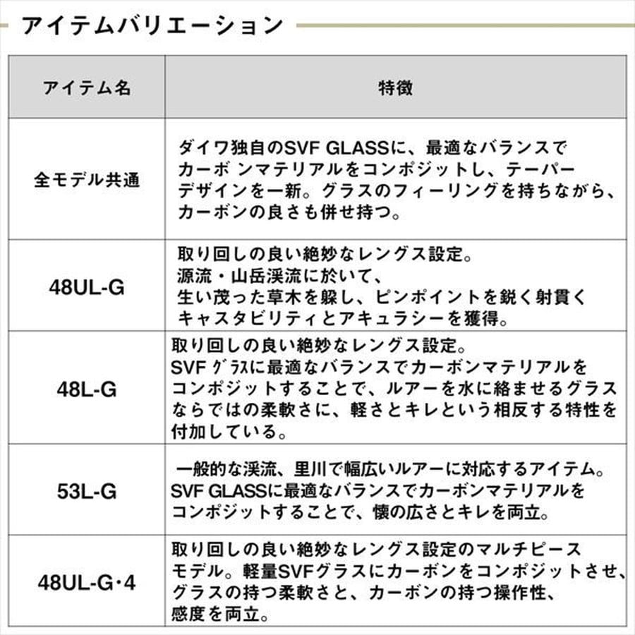 グラスロッドの新領域、シルバークリーク グラスプログレッシブに本流攻略モデルが追加。■61L-G・・・6'1"のレングス優位性によるロングアプローチと、グラス特有の柔軟性による水に馴染む生きたルアーアクションを引き出し、神経質な流域に潜む大鱒に口を使わせるロッド。柔軟さの中に、僅なチャンスをとらえるフッキングパワーも兼ね備えた。★全長:1.85m