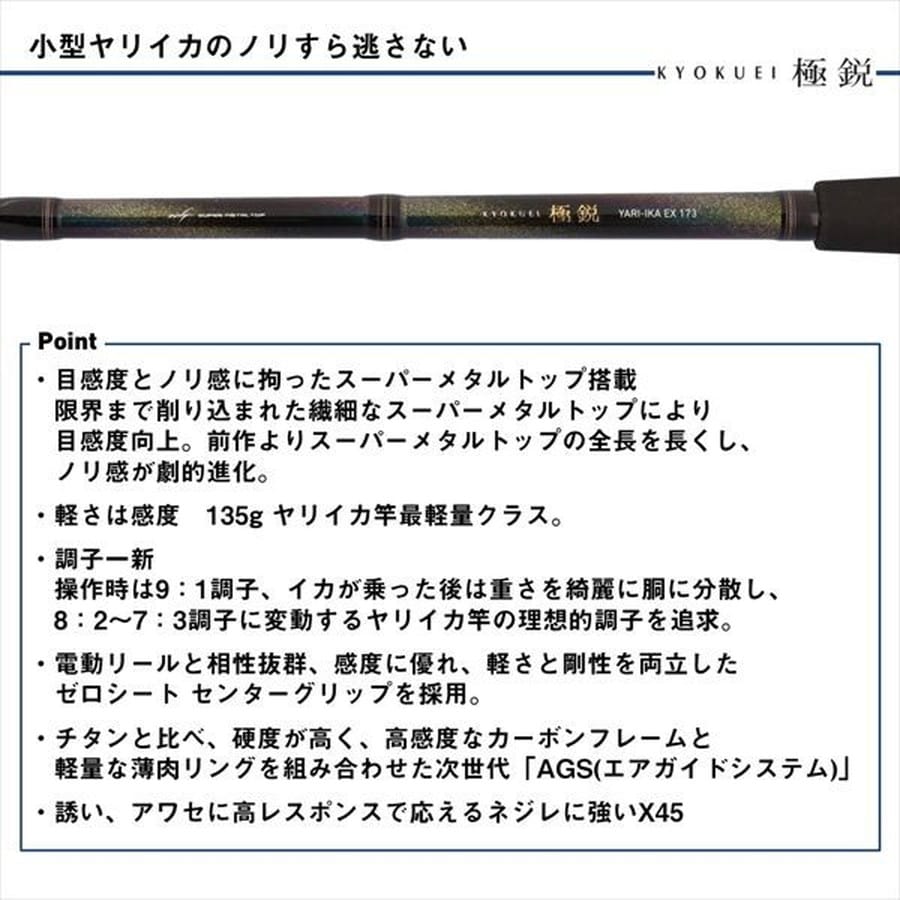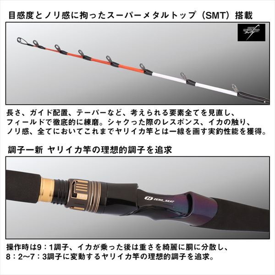 200m先の小型ヤリイカのノリすら逃さない ダイワ史上最高の目感度を実現。圧倒的な手返しの良さと、意のままの操作性を実現した鋭敏ショートモデル。■目感度とノリ感に拘ったSMT搭載。限界まで削り込まれた繊細なSMTにより目感度向上。これまでよりSMT全長を長くし、ノリ感が劇的進化。■軽さは感度 標準自重130g。ヤリイカ竿最軽量クラス。■理想の調子を追求。操作時は9:1調子、イカが乗った後は重さを綺麗に胴に分散し、8:2~7:3調子に変動するヤリイカ竿の理想的調子を追求。■電動リールと相性が良く、感度に優れ、軽さと剛性を両立したゼロシート センターグリップを採用 ■チタンと比べ、硬度が高く、高感度なカーボンフレームと軽量な薄肉リングを組み合わせた次世代「AGS」■テスター陣のノウハウを数値化し、具現化するESS設計。■誘い、アワセに高レスポンスで応えるネジレに強いX45