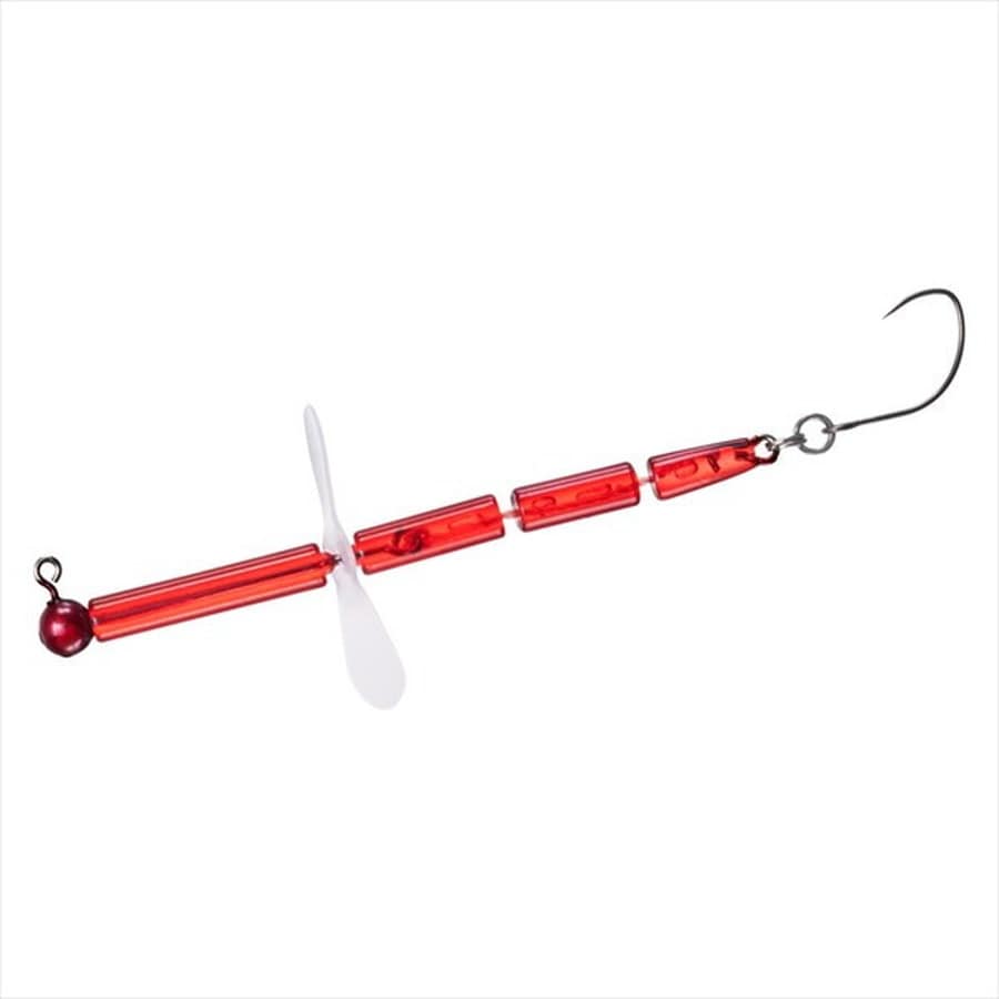 スクリューの回転とテールの微振動で誘う!鱒ノ小枝とデザインは似ているが、全く異なるアクション。前側2節は金属シャフトで繋がり、そのシャフトに中心線から取り付け穴をずらしたスクリューをセットすることでアンバランスな回転による振動が糸で繋がった後側2節に伝わり、テールを細かく震わせる。薄型樹脂製スクリューはデッドスローでもしっかり回転して視覚、水の動き、テールの微振動でトラウトにアピール。★自重:1.5g 標準装備フック:SaqSasショートマルチ#8 標準装備リング:#0×2