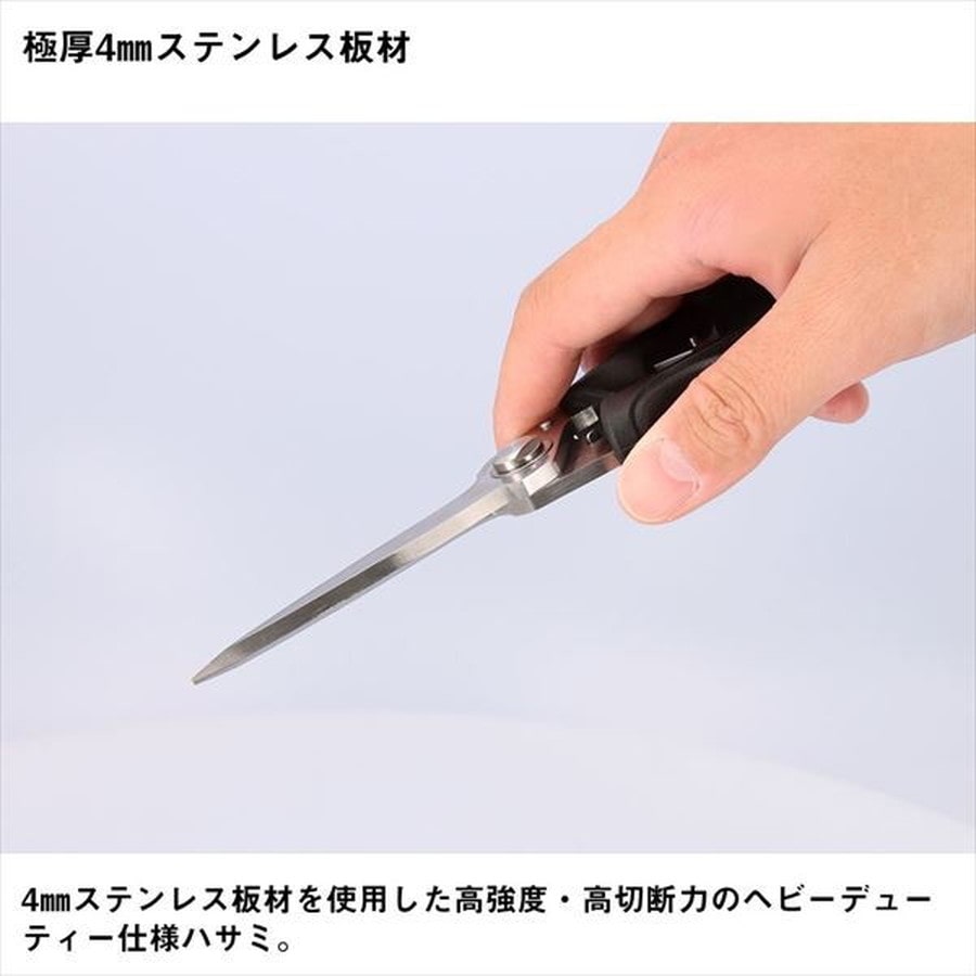 4mm極厚ステンレス材使用の高強度・高切断力のヘビーデューティー仕様ハサミ。魚を〆る、頭や尾を切り落とす、腹を開くことが可能。トゲやヒレもラクラクカット。ロープや太いハリス、漁網も切断可能なセレーション付き。握りやすく力を入れやすいパワーグリップ。刃素材:錆に強く切れ味が長持ちするステンレス製。★サイズ:約190mm