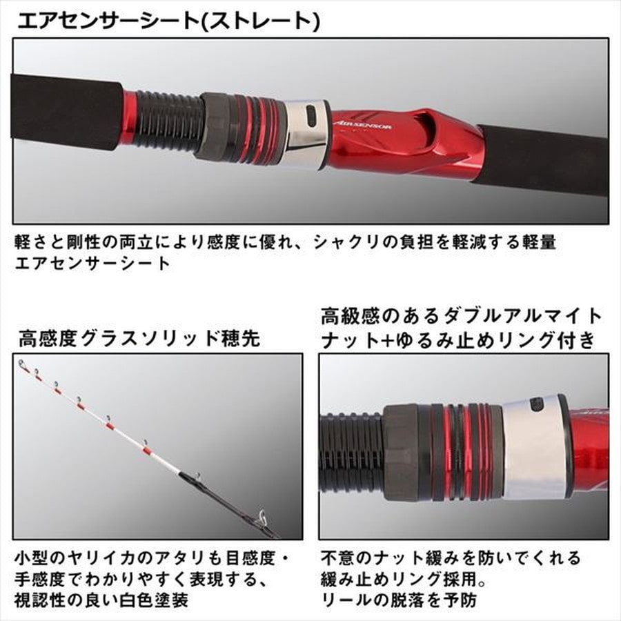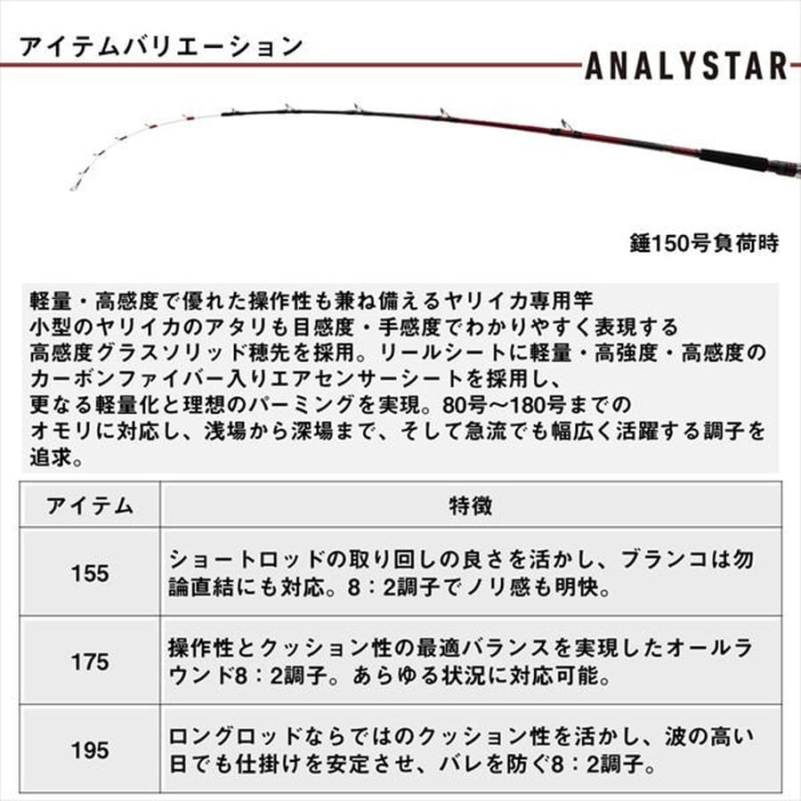 軽量・高感度で優れた操作性も兼ね備えるヤリイカ専用竿。クラスを超越した性能&デザイン仕様。浅場から深場まで、急流でも幅広く活躍する操作性の良い8:2調子。錘負荷180号表記。最近の傾向である深場急潮にも対応可能。携行性の良いセンターカット2PCS。◆195・・・ロングロッドならではのクッション性を活かし、波の高い日でも仕掛けを安定させ、バレを防ぐ8:2調子。★全長:1.95m