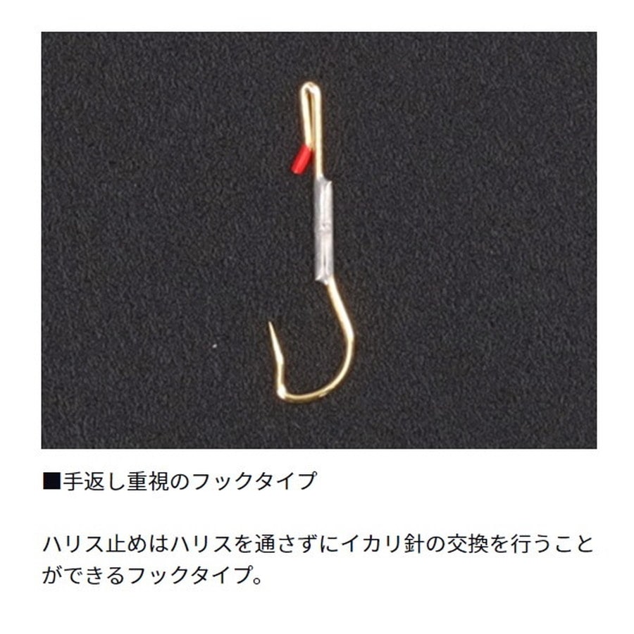 徳用24本入り。差しやすく抜けにくい定番サカサ針のマーキング付きフックタイプ。差しやすく抜けにくいダイワ独自の先出し形状の針を搭載したフック式サカサ針。ハリス止めはハリスを通さずにイカリ針の交換を行うことができるフックタイプ。ハリス止めの先端にマーキングを施すことでハリスを沿える場所がわかりやすくハリス交換をより素早く確実に行うことが可能。★サイズ:2号 入数:24本