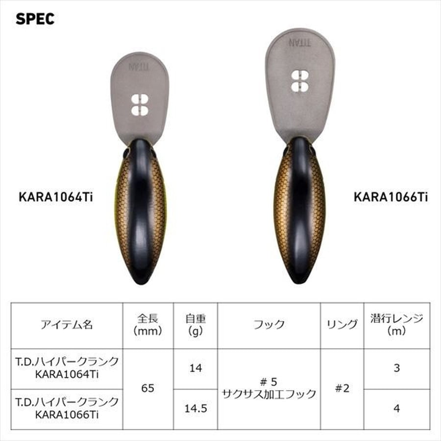 T.D.ハイパークランクの中身を空っぽに!代替の効かないクランクベイト!チタンリップ搭載によりデッドスローでもワイドアクションを実現。◆ノンウエイトによるハイフロート&ワイドアクション ◆ディープクランクではなく、カバークランクとして使うのがおススメ。 ◆リップに板おもりを貼るシンキングチューンで更なるディープ攻略も可能。