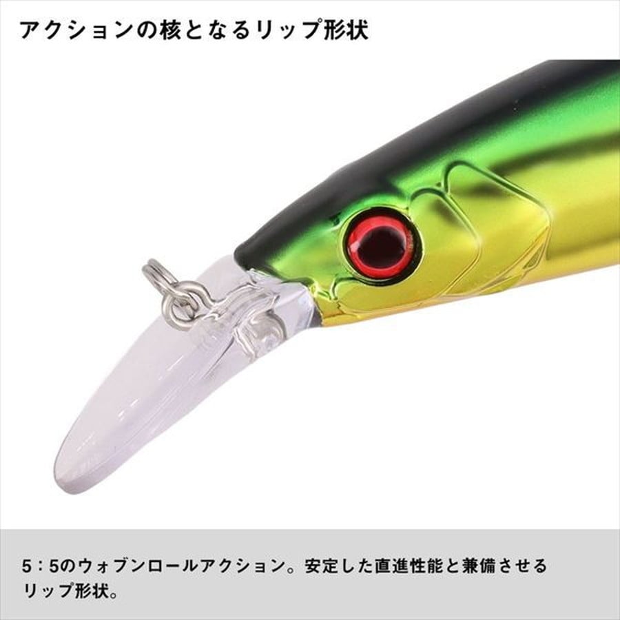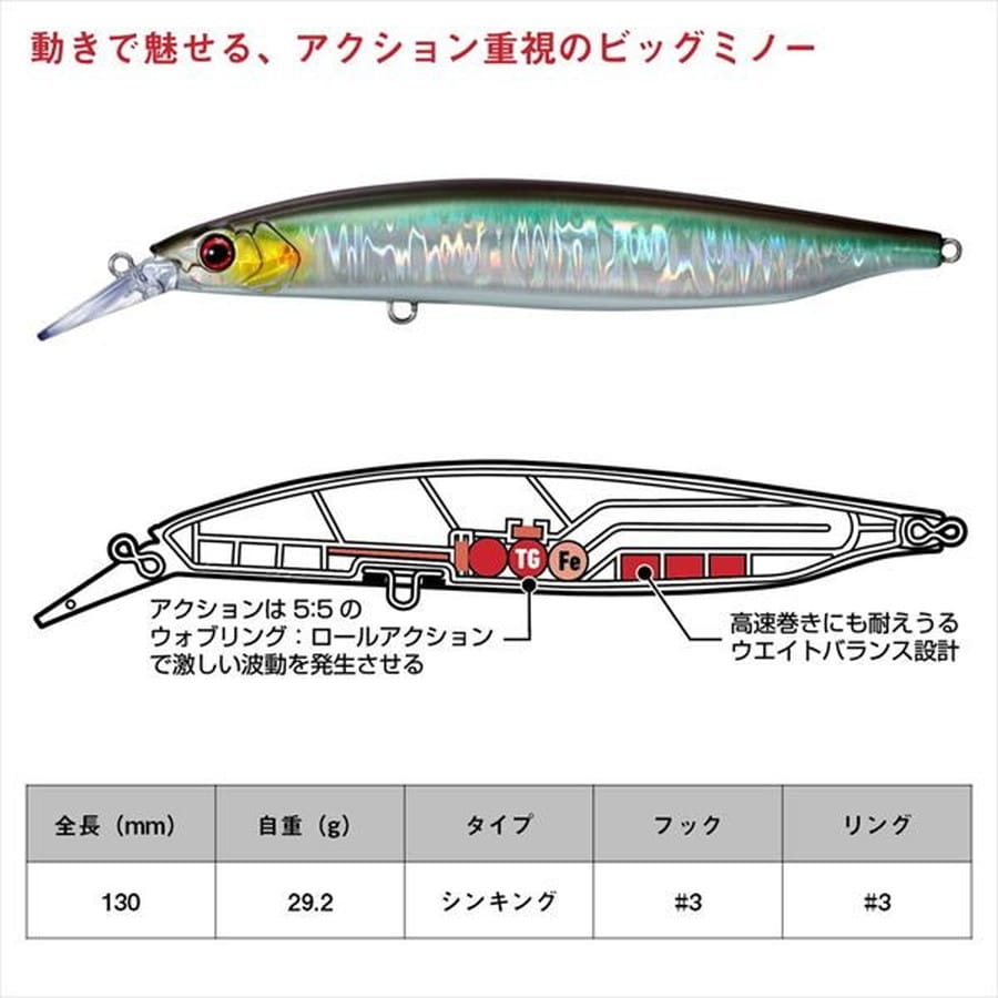 「ターゲットに外道無し」 淡水、海水を選ばない魚と遊ぶためのミノー!村上晴彦監修。動きで魅せる、アクション重視のビッグミノー。アクションは激しい波動を発生させる5:5のウォブルロールアクション。高速巻きにも耐えうるウエイトバランス設計。