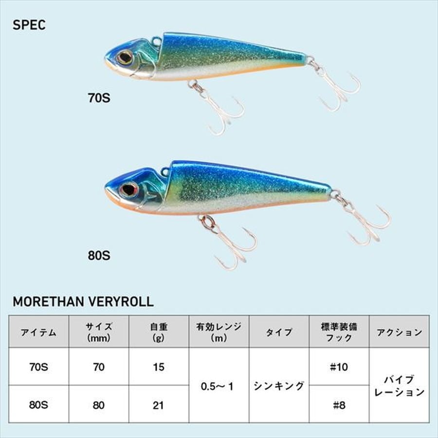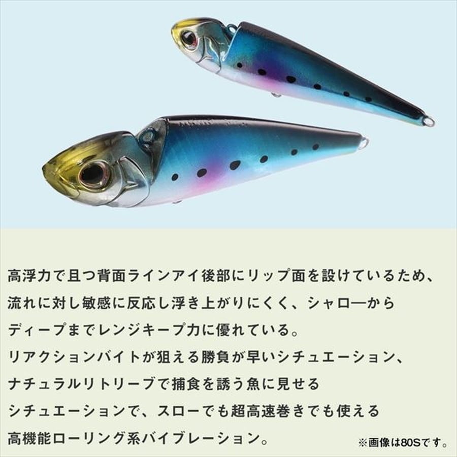 ソルトバイブシリーズに新たなアクションの追加!フィッシュライクなシェイプ&特殊なリップ形状とボディ構造により、8:2のローリング:ウォブリングアクション、水平に近いナチュラルなスイム姿勢、軽快な引き心地を実現したモアザンベリーロール。高浮力かつ背面ラインアイ後部にリップ面を設けているため、流れに対し敏感に反応し浮き上がりにくく、シャローからディープまでレンジキープ力に優れている。リアクションバイトが狙える勝負が早いシチュエーション、ナチュラルリトリーブで捕食を誘う魚に見せるシチュエーションで、スローでも超高速巻きでも使える高機能ローリング系バイブレーションとなっている。★全長:70mm