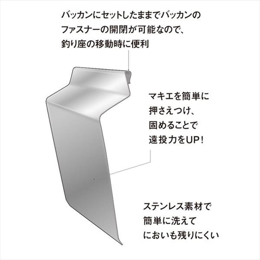 実釣から導き出したボード角度!マキエを簡単に押さえつけ、固めることで遠投力をUP!ボードを角度付きにするでマキエを押さえつける時の腕の負担を軽くし、疲れにくい。バッカンにセットしたまま、バッカンのファスナーの開閉が可能なので、釣り座の移動時に便利。ステンレス素材で簡単に洗えてにおいも残りにくい。