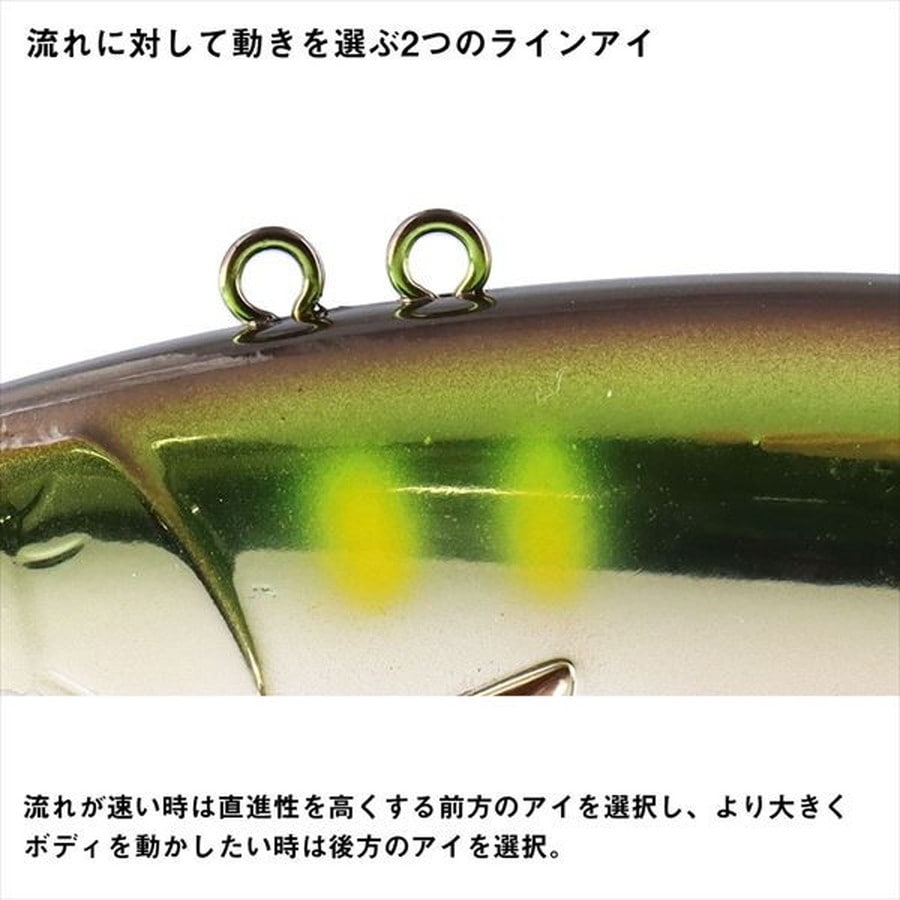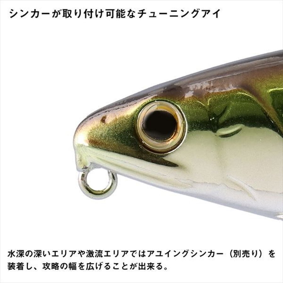 ジョイントが繰り出す艶めかしいアクション!様々なシュチュエーションの瀬を攻略出来るルアー。重心はよりヘッドの先端部に集中させ、頭下がりの姿勢で泳ぎ、二つのラインアイを使い分けることにより急瀬やチャラ瀬など多様な瀬に対応する。直進性を高め、急瀬の中でしっかりと引きたい時は前方のラインアイを、チャラ瀬などでより大きくボディを動かしたい時は後方のラインアイを使用。また、ハリス止め後方にシリコンスリットを配置したことで、ハリス止めの動きを抑え、ライントラブルを軽減させる。